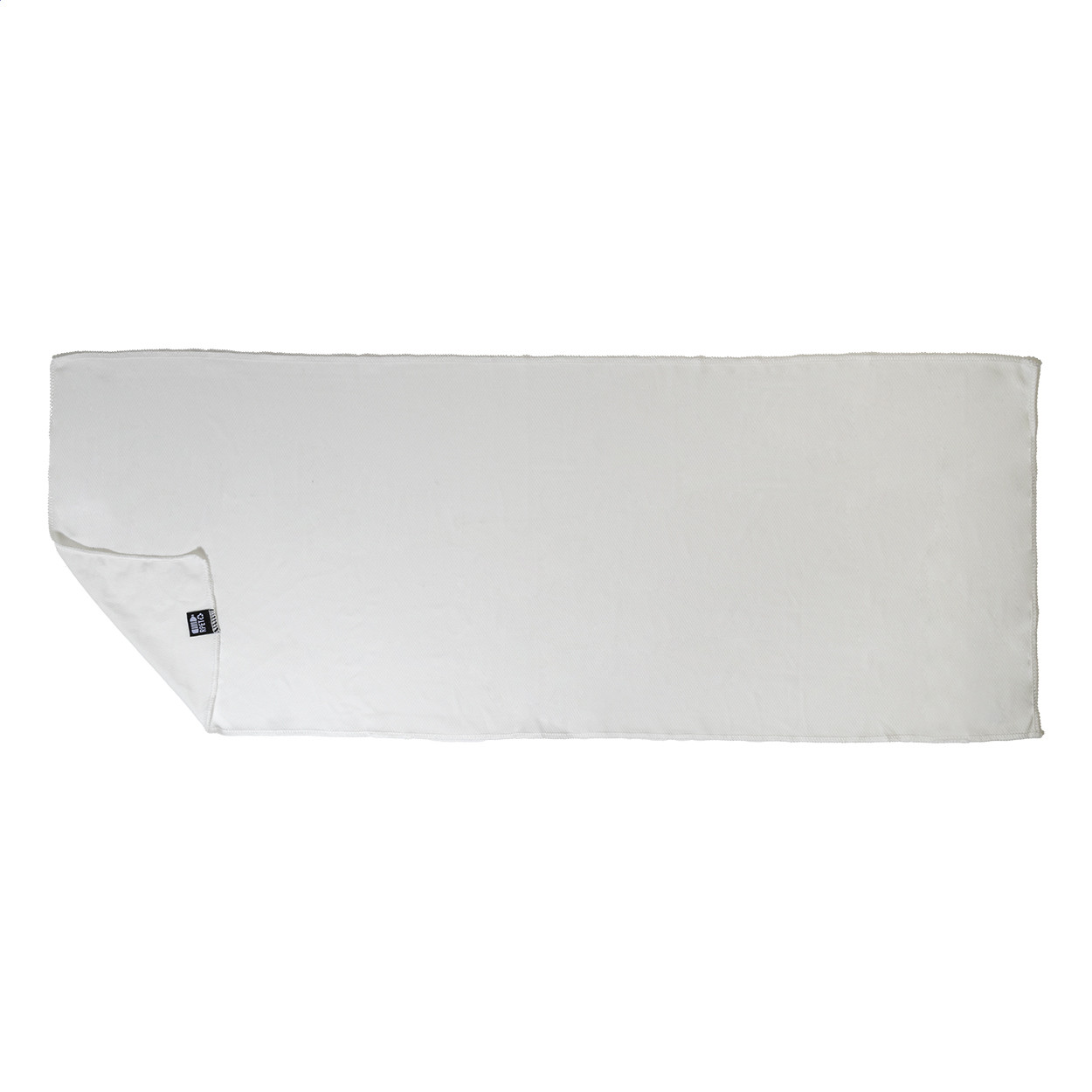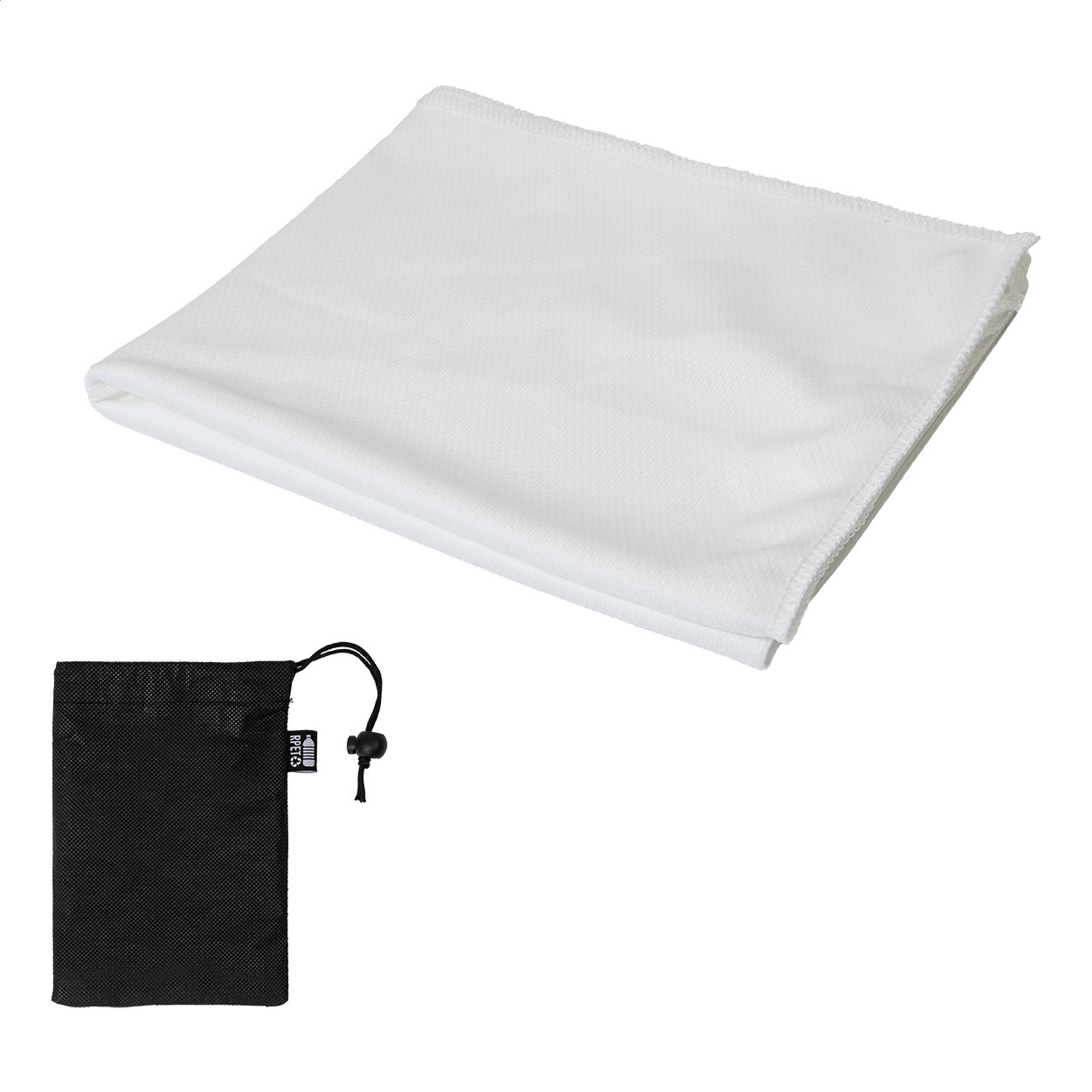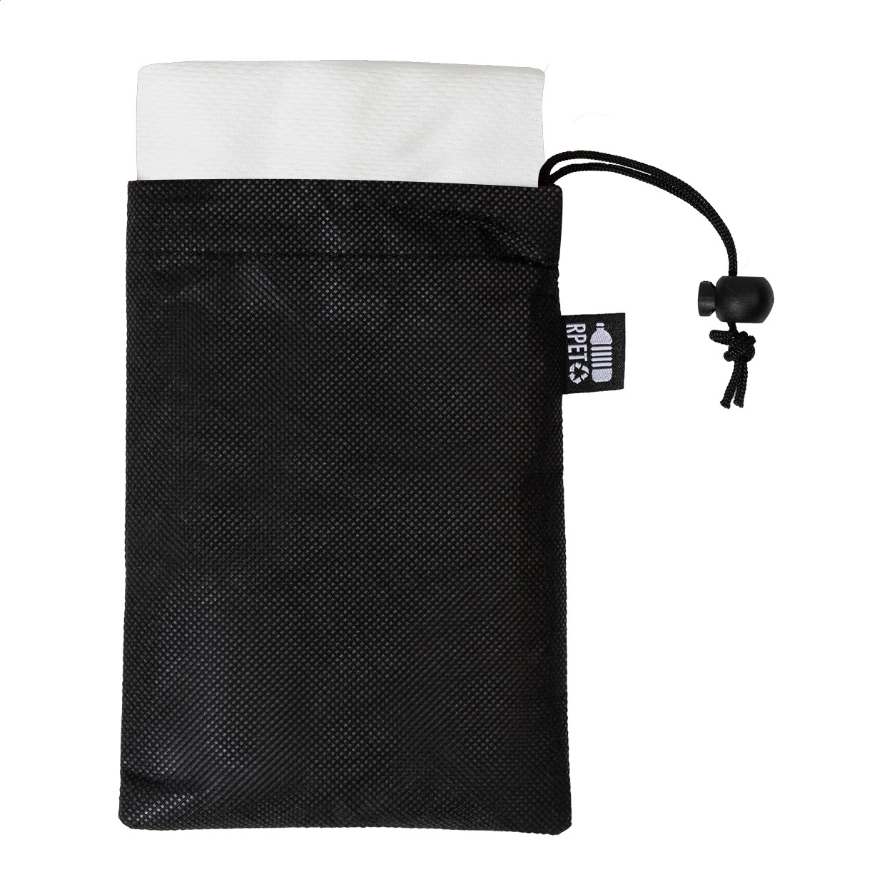 RPET mikroszálas sporttörölköző RPET non-woven hordtáskában, megkülönböztető RPET címkével. RPET poliészter, 140 g/m².