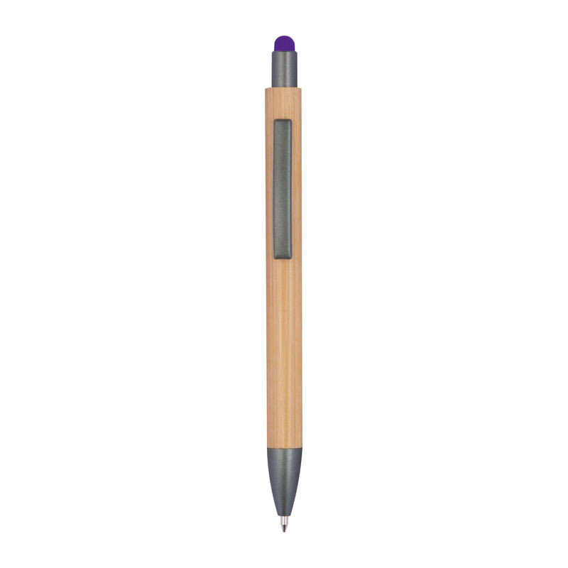 Környezetbarát, bambusz golyóstoll, nagy kéken író tollbetéttel, antracit színű kiegészítőkkel és érintőképernyő funcióval.