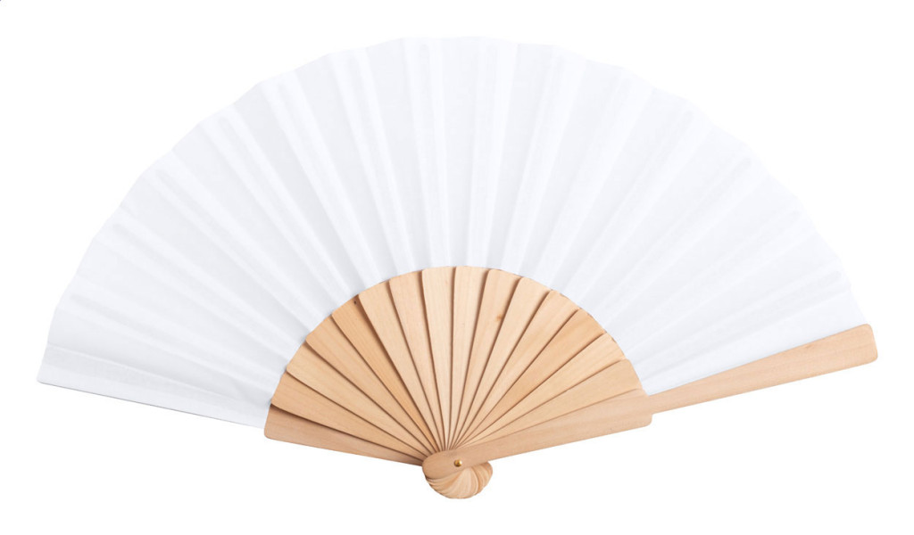 RPET poliészter kézi legyező fa vázzal. Kraft papír dobozban.