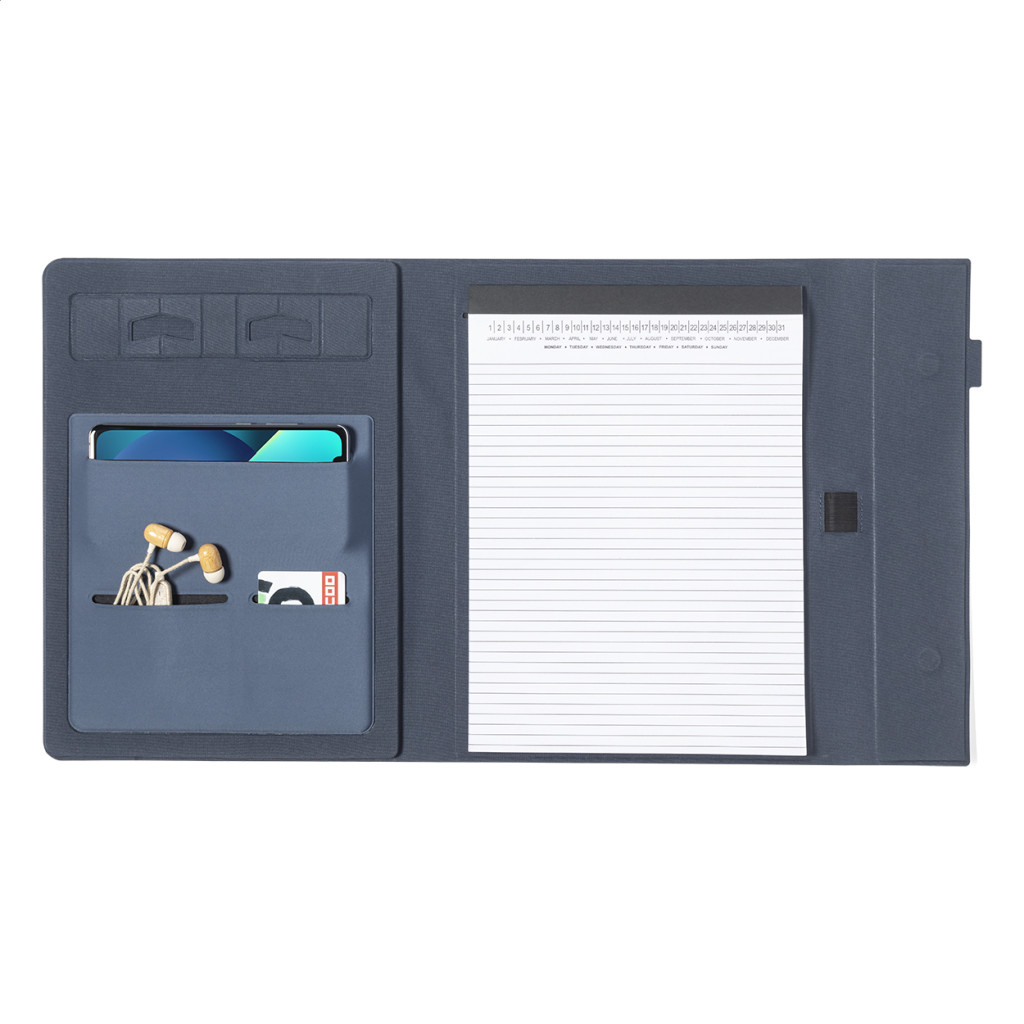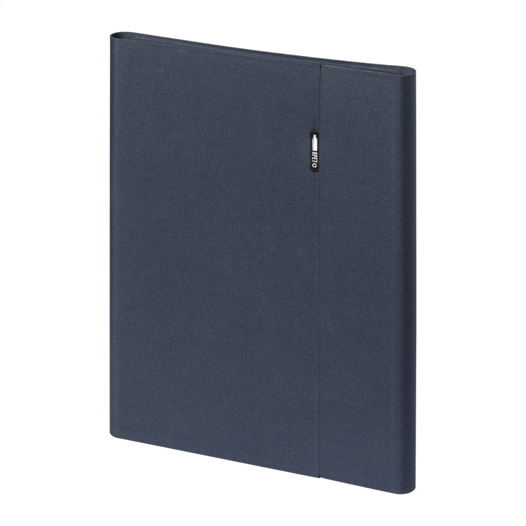 A4 méretű, 600D RPET poliészterből készült iratmappa mágneses zárral, összehajtható mobiltelefon-tartóval és 20 vonalas lappal. Megkülönböztető RPET címkével ellátva.