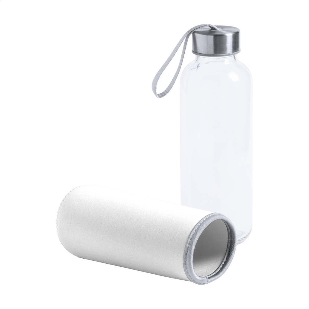 Üveg kulacs hordszíjjal és színes neoprén borítással. 420 ml. Nem alkalmas szénsavas italok tárolására.