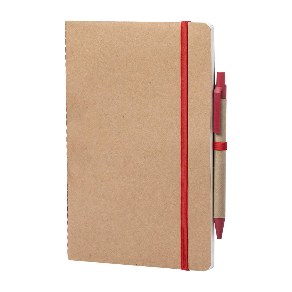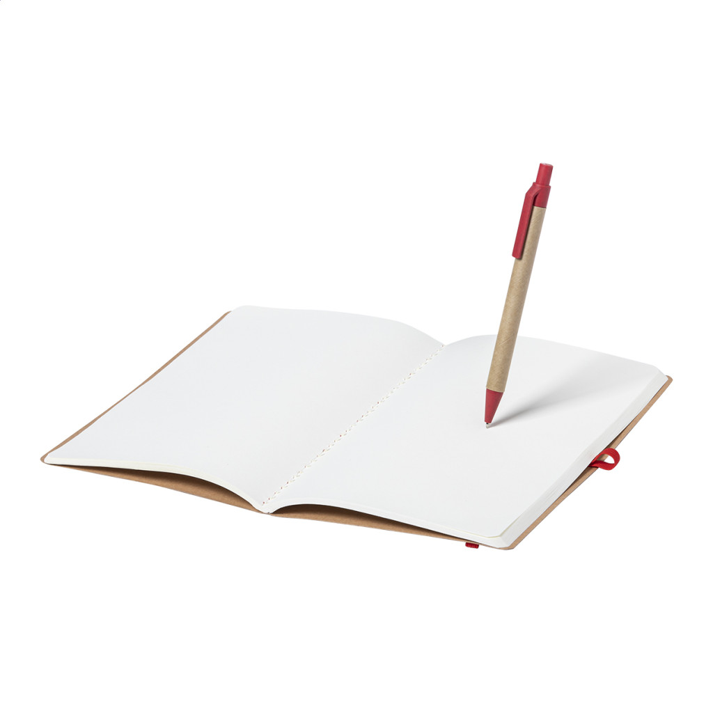 Újrahasznosított karton borítású jegyzetfüzet 60 sima lappal és színes gumipánttal, A5 méretű. Búzaszalma műanyag golyóstollal, kék tollbetéttel.