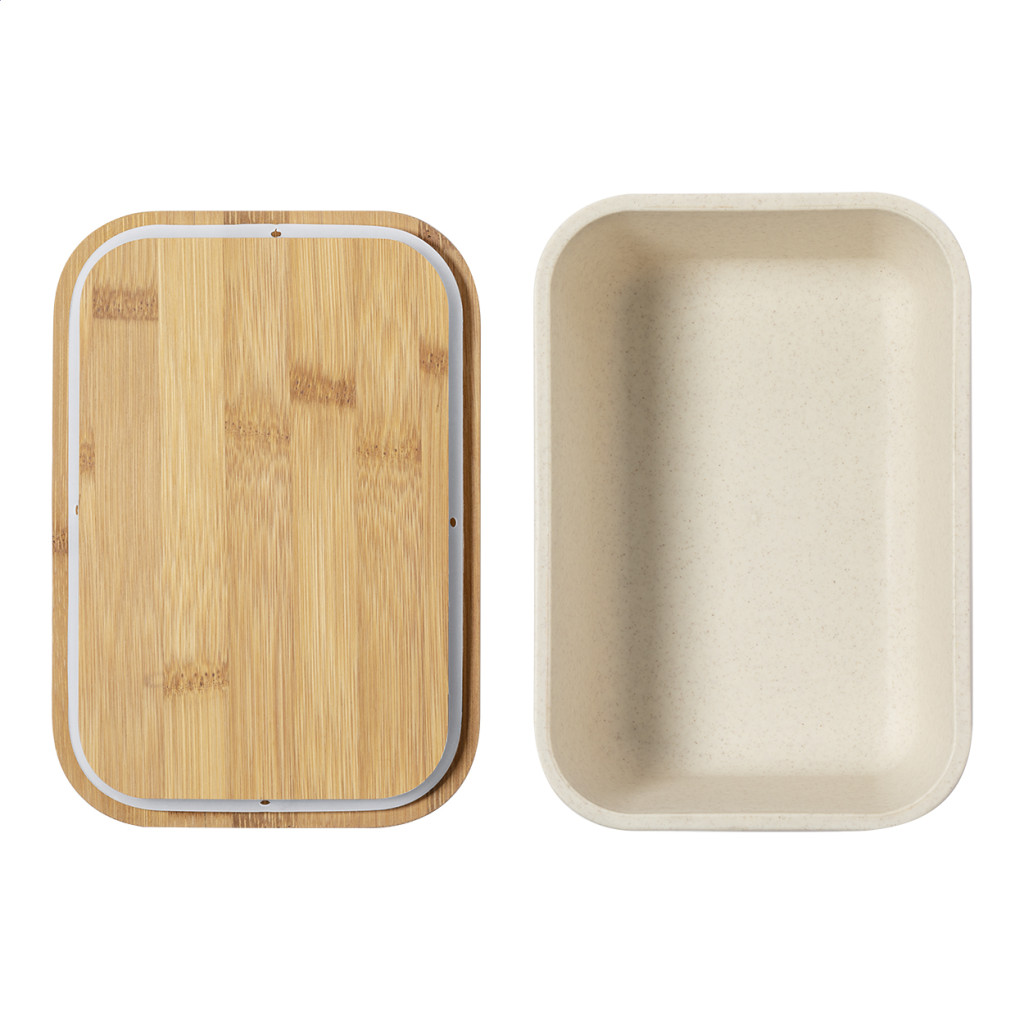 PP műanyag uzsonnás doboz, bambusz tetővel és rugalmas pánttal. 1000 ml.
