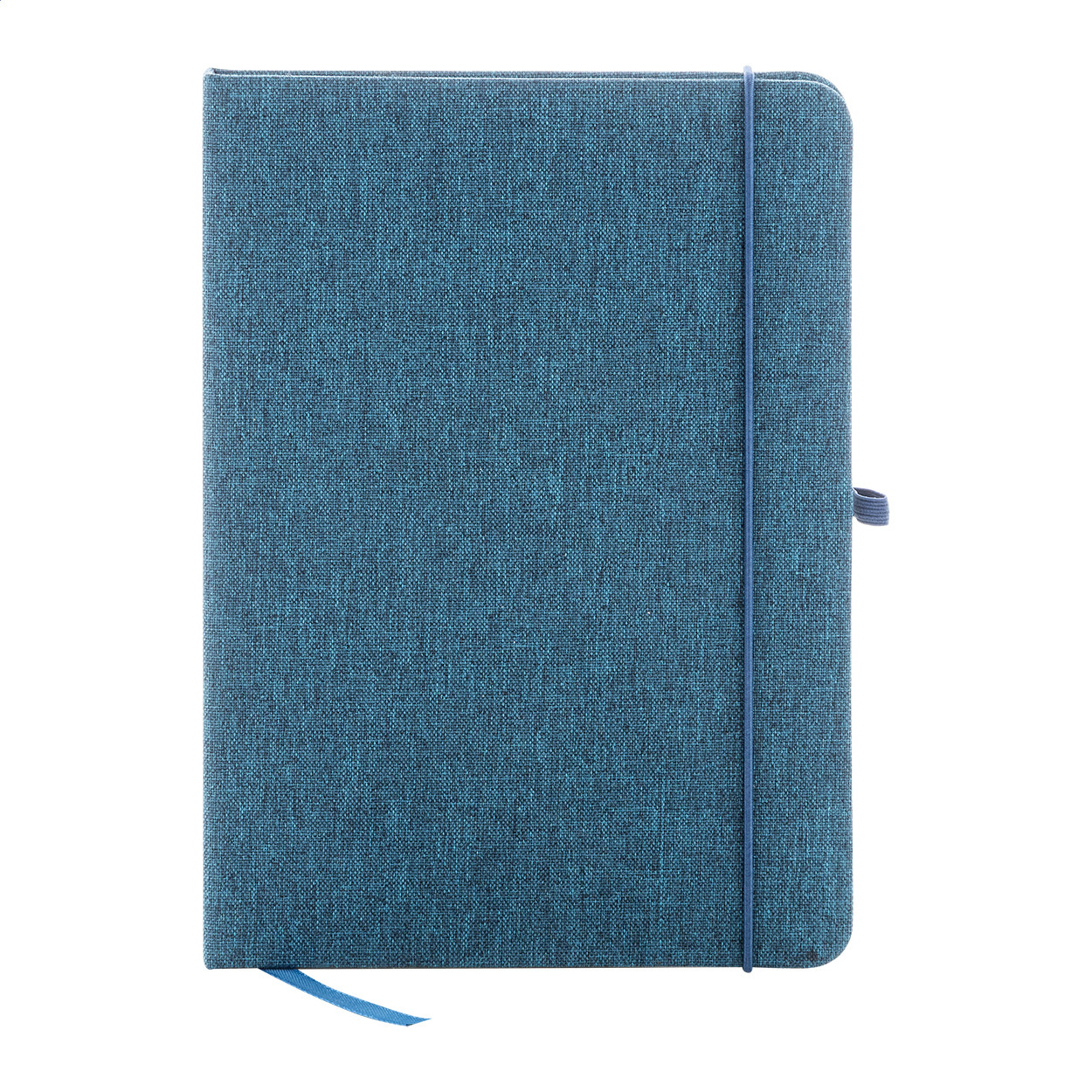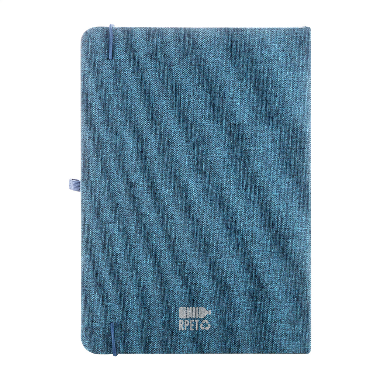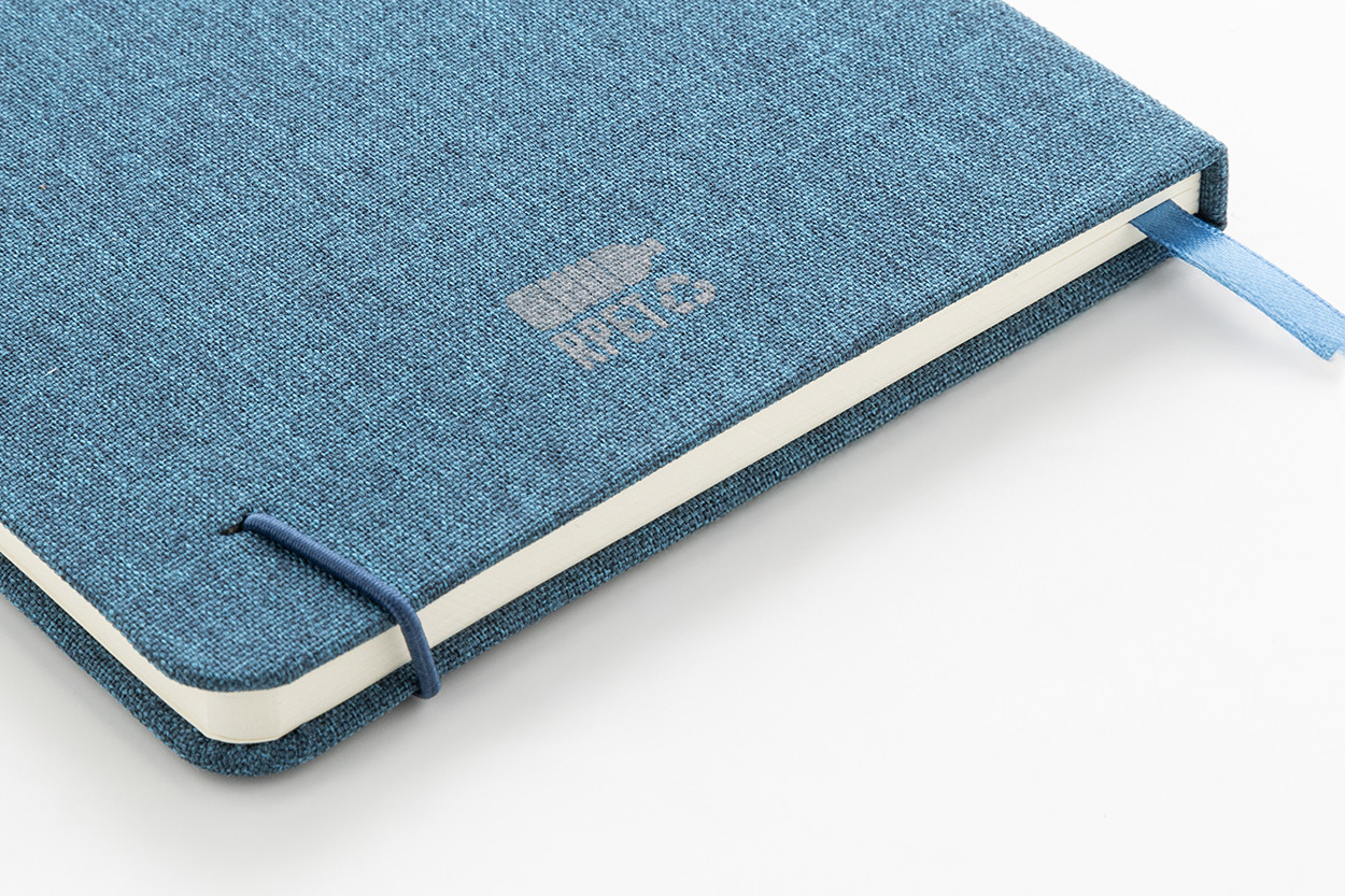 300D RPET poliészter borítású jegyzetfüzet 80 sima lappal. Hozzáillő színű gumipánttal, könyvjelzővel és tolltartóval. A5 méretű.