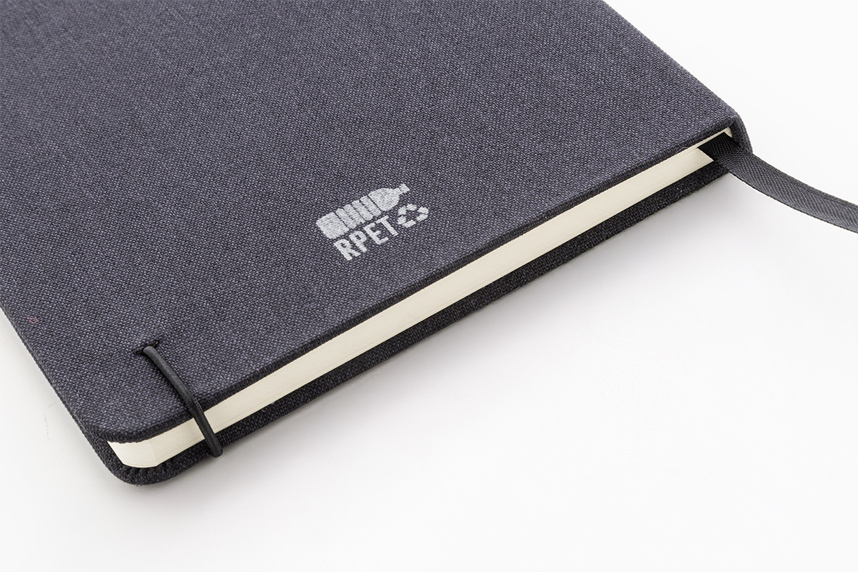 300D RPET poliészter borítású jegyzetfüzet 80 sima lappal. Hozzáillő színű gumipánttal, könyvjelzővel és tolltartóval. A5 méretű.