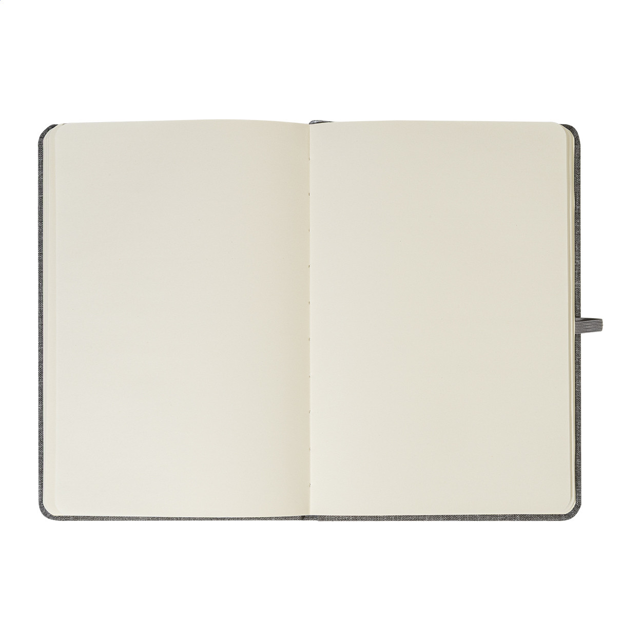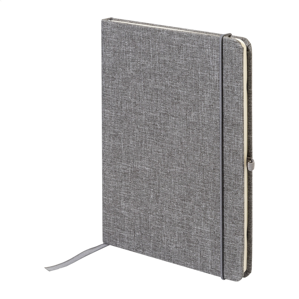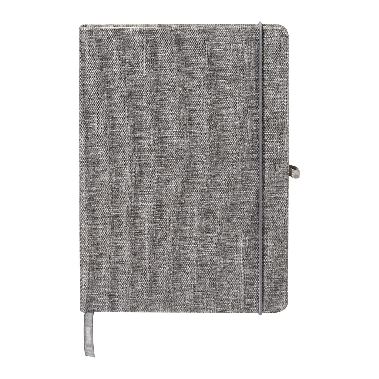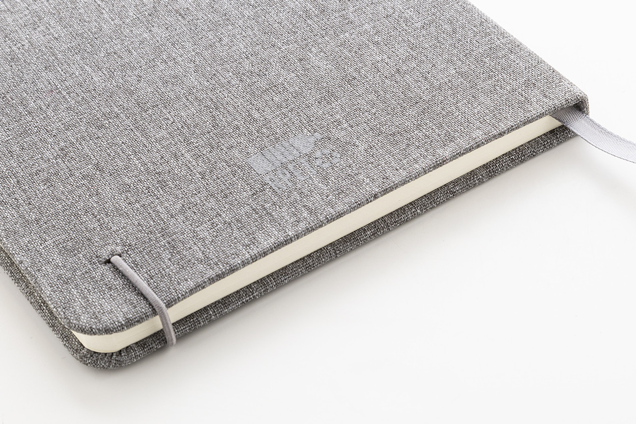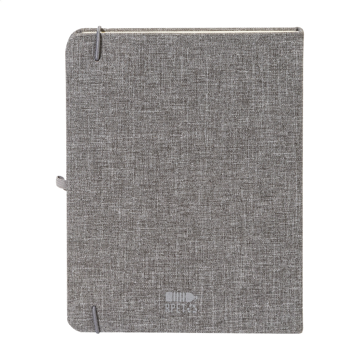 300D RPET poliészter borítású jegyzetfüzet 80 sima lappal. Hozzáillő színű gumipánttal, könyvjelzővel és tolltartóval. A5 méretű.