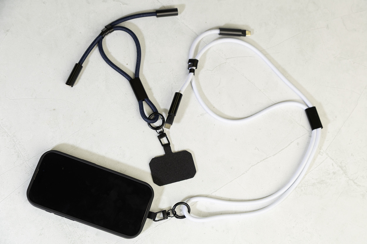 RPET mobiltartós nyakpánt telefonbetéttel, karabinerrel és beépített USB-C - USB-C töltőkábellel, rejtett csatlakozókkal. 60 W-os PD gyorstöltést és adatátvitelt támogat.