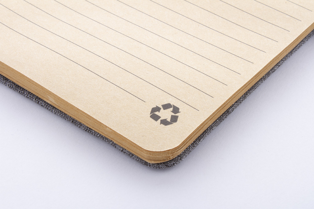 RPET poliészter borítású spirál jegyzetfüzet, búzaszalma műanyag telefon- és tablettartó betéttel. 70 újrahasznosított kraft papírból készült vonalas lappal, gumis pánttal és tolltartóval. A5 méretű.