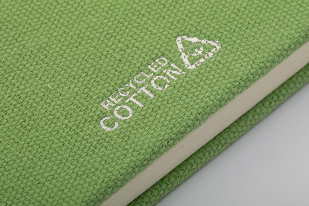 Újrahasznosított pamut borítású jegyzetfüzet 80 vonalas lappal, újrahasznosított papírból. Megegyező színű könyvjelzővel, gumiszalaggal és tolltartóval. A5 méretű.