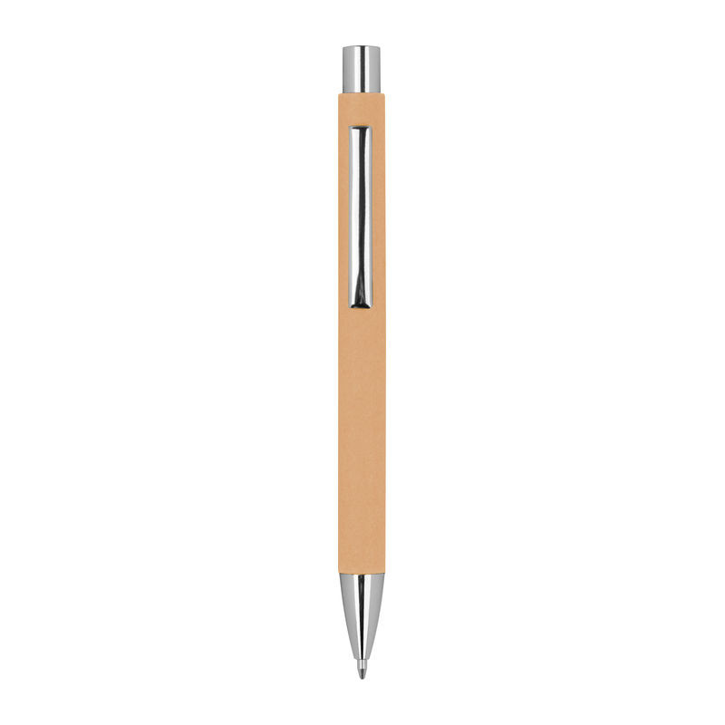 Környezetbarát kéken író golyóstoll kartonból, fém klipsszel.
