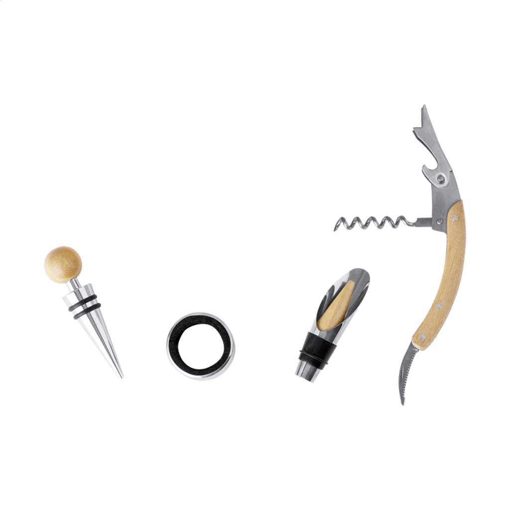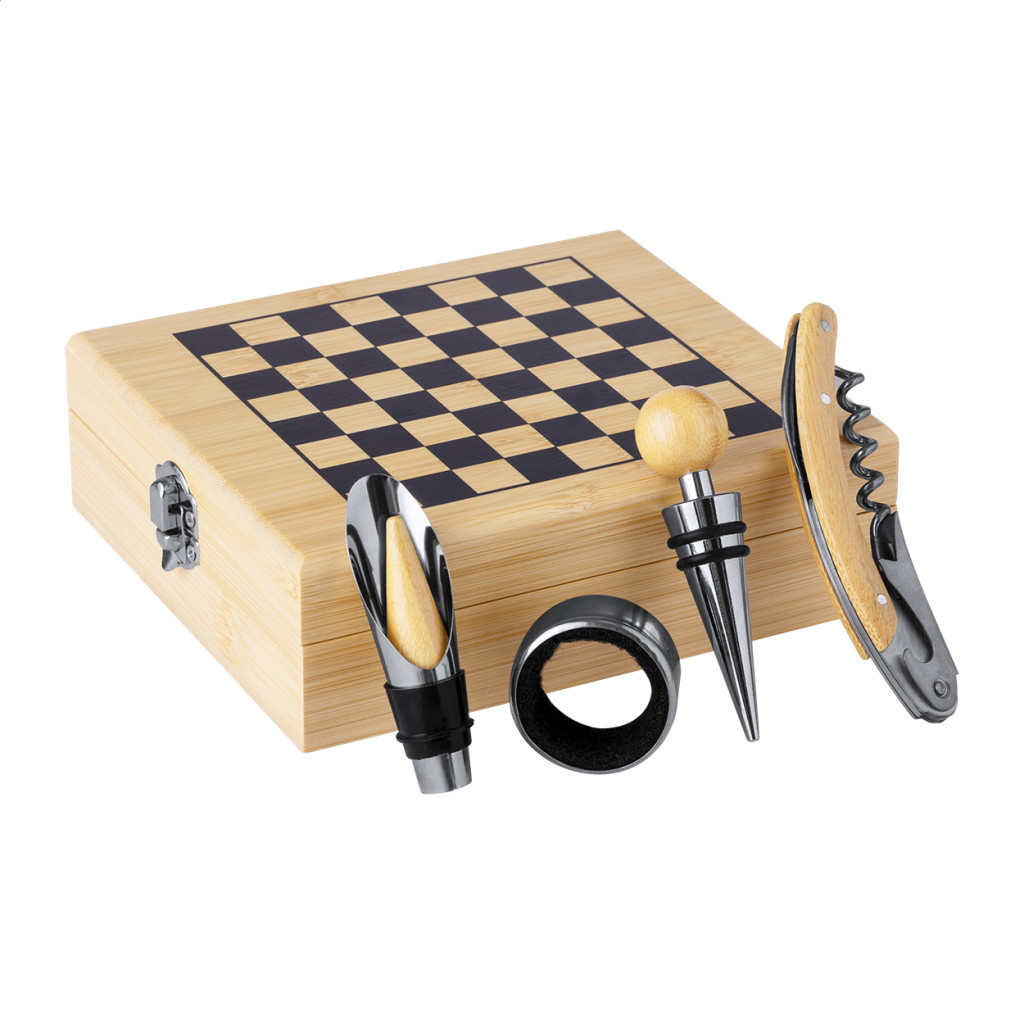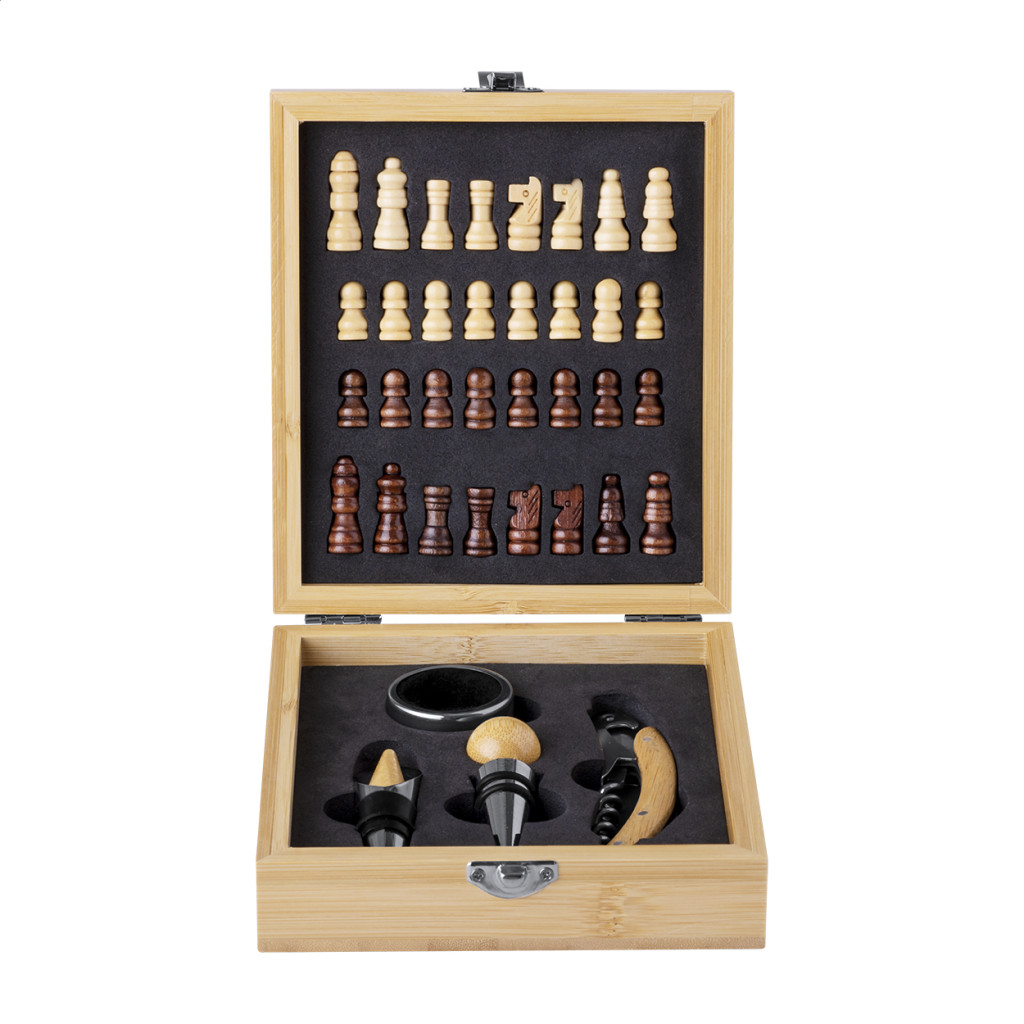 4 db-os bambusz betétes, rozsdamentes boros szett bambusz dobozban, sakktáblával és 32 sakkfigurával. Tartalmaz egy dugóhúzót, cseppőrt, fúvókát és dugót.