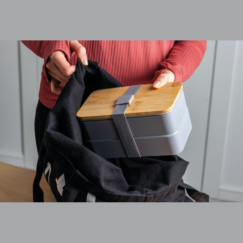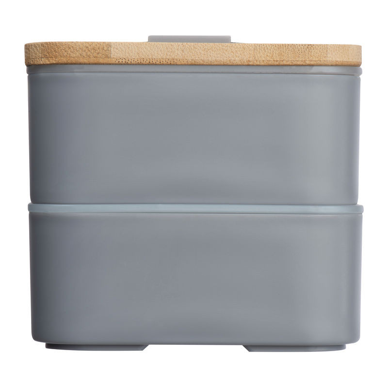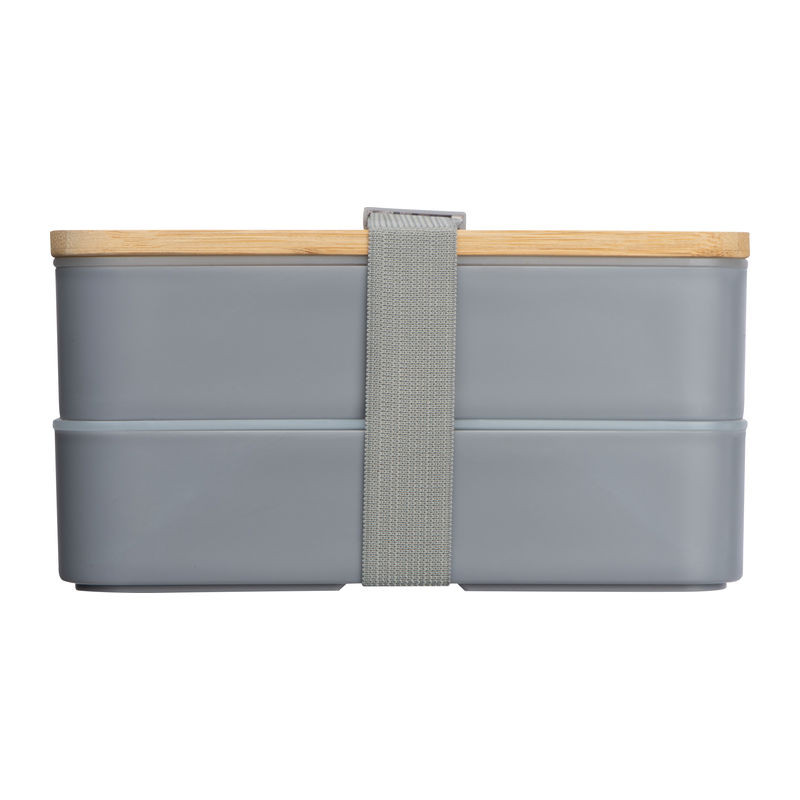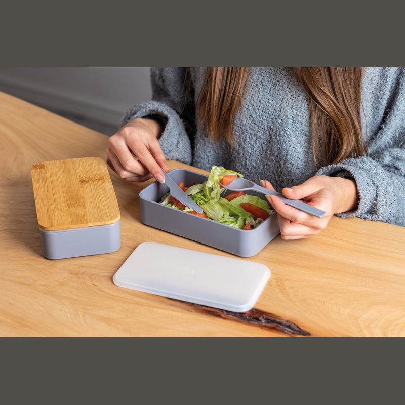 Kétszintes ételtartó és uzsonnás doboz két külön rekesszel, egy bambusz fedéllel. Leválasztó, kés és villa, valamint gumiszalaggal a záráshoz.