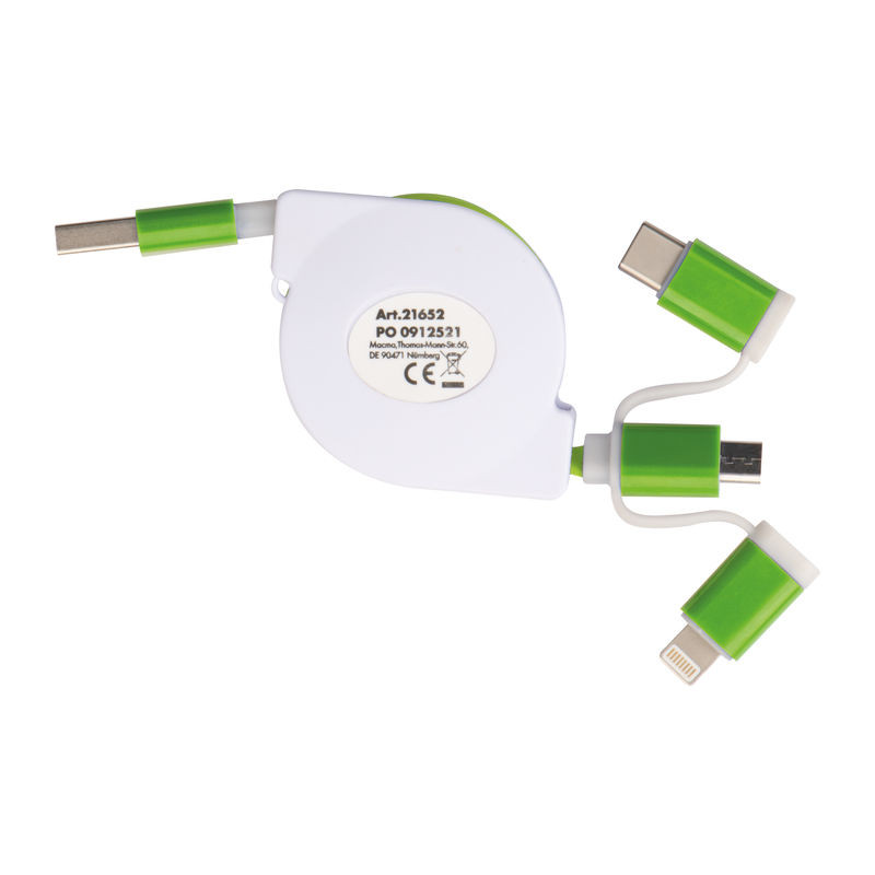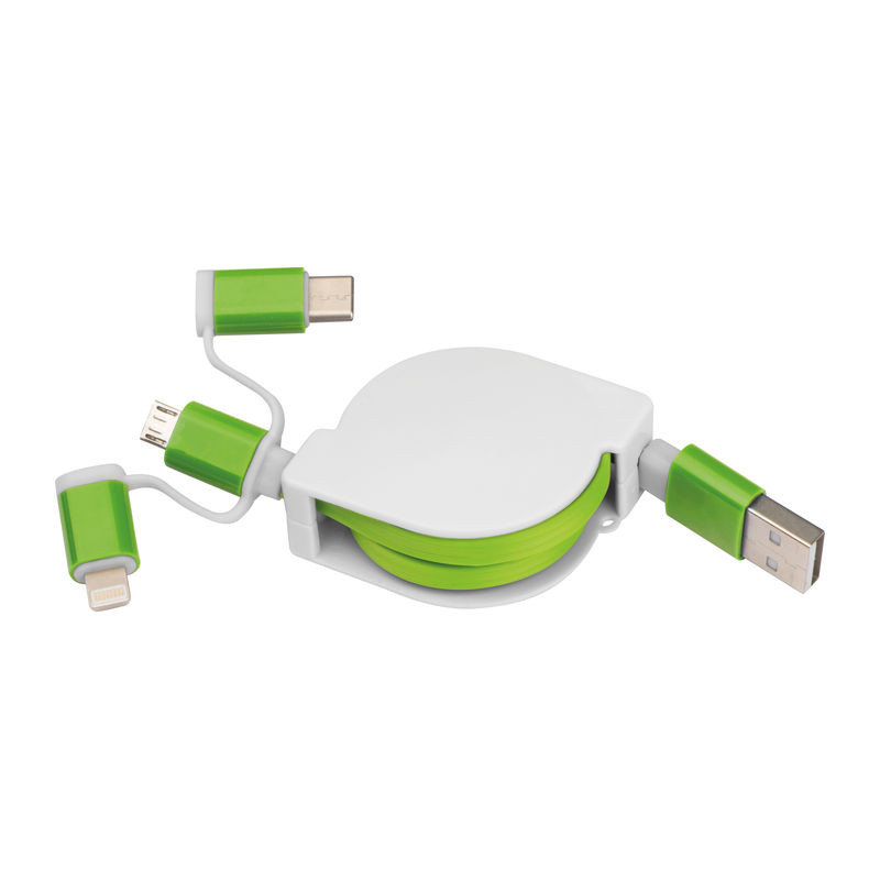 Kihúzható töltő és adatkábel műanyag házban, USB csatlakozóval, valamint iOS Lightning, C-Type és Micro USB csatlakozóval. Töltési teljesítmény max. 5V/2A. Kábel hosszúság kb. 80 cm.