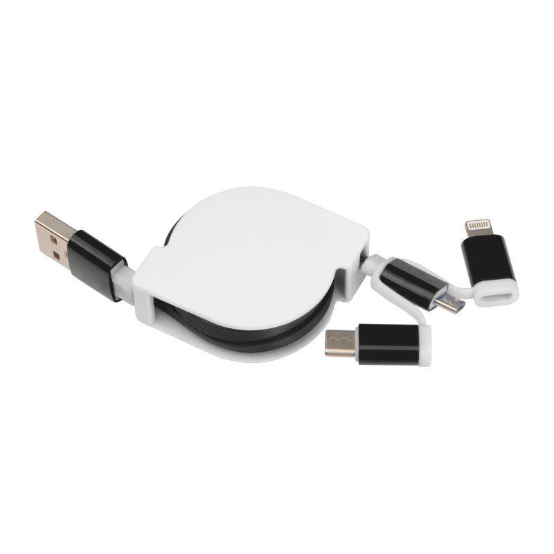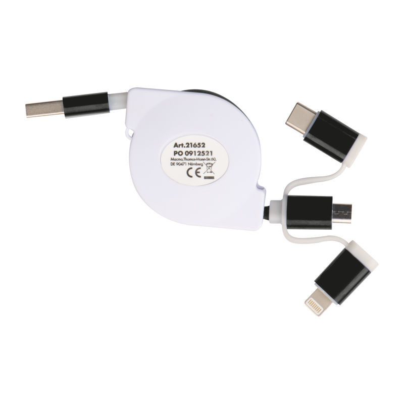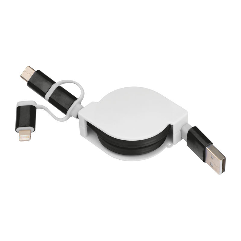 Kihúzható töltő és adatkábel műanyag házban, USB csatlakozóval, valamint iOS Lightning, C-Type és Micro USB csatlakozóval. Töltési teljesítmény max. 5V/2A. Kábel hosszúság kb. 80 cm.