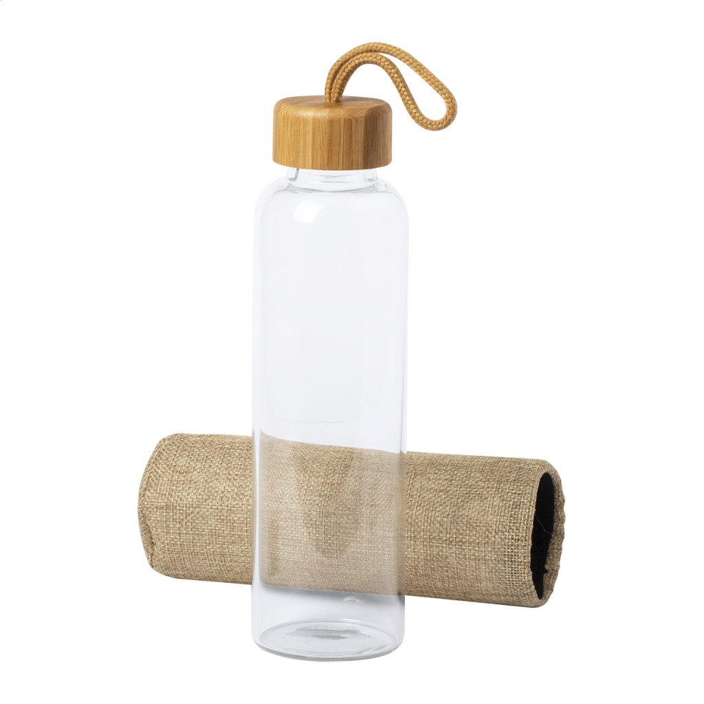 Üveg kulacs, természetes színű poliészter borítással, bambusz fedéllel és hordpánttal, 500 ml. Nem alkalmas szénsavas italok tárolására.
