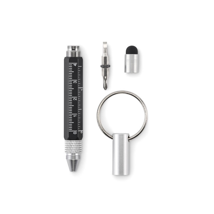 Kulcstartó csavarzáras golyóstollal újrahasznosított alumíniumból, 4 cm-es és 1 ,5 colos mini vonalzóval, érintőheggyel és 2 az 1-ben lapos- és csillag csavarhúzóval. Feketén író betéttel.