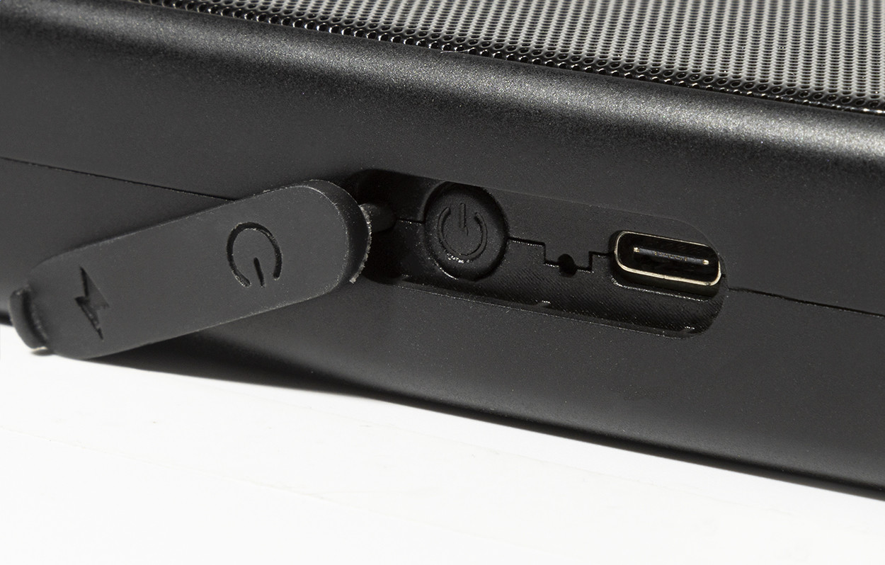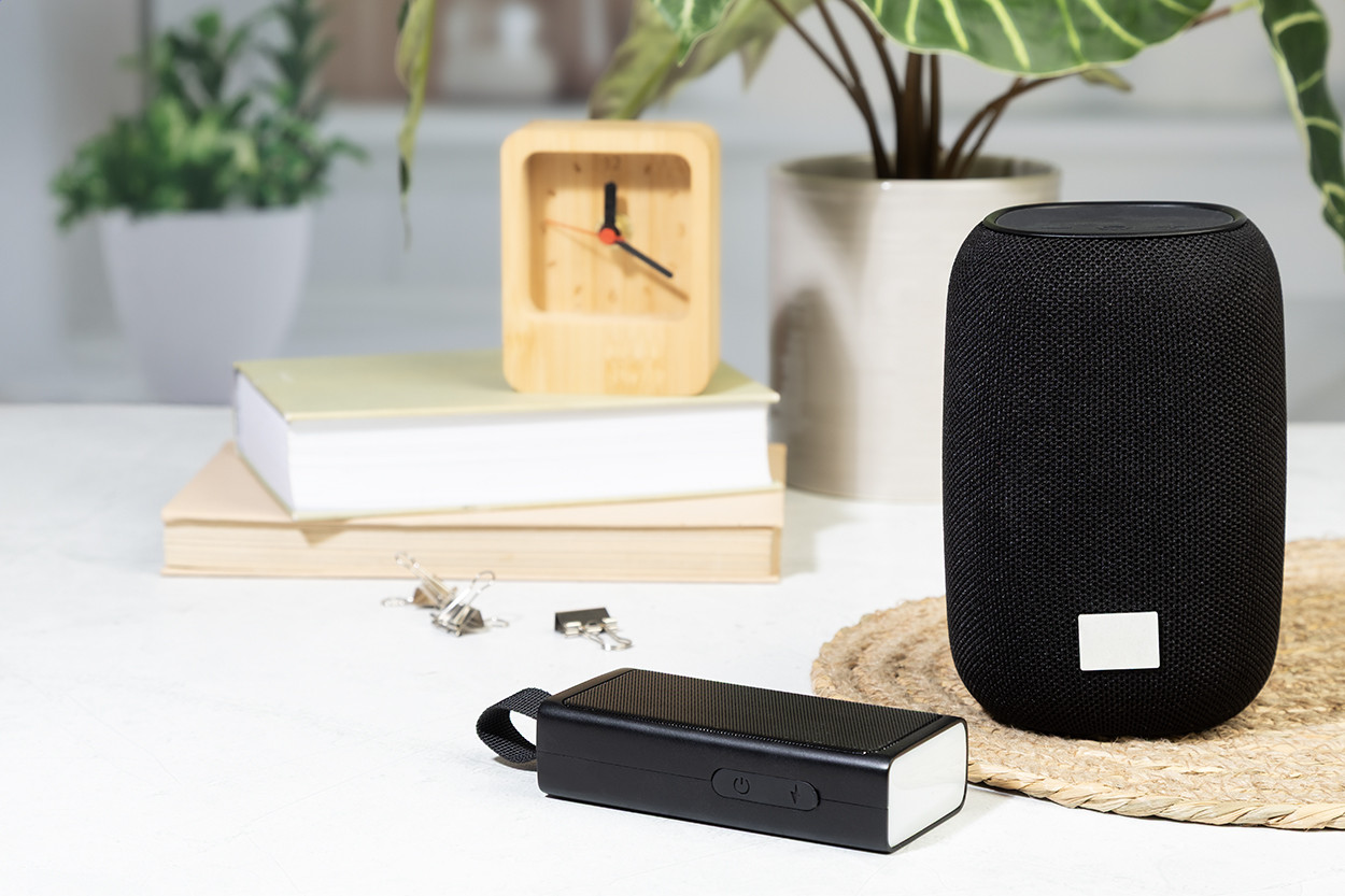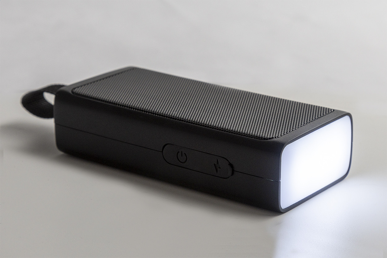 Újrahasznosított ABS vezeték nélküli hangszóró fém hálóval, LED zseblámpával és mágneses funkcióval. Beépített újratölthető akkumulátorral (500 mAh). USB töltőkábellel.