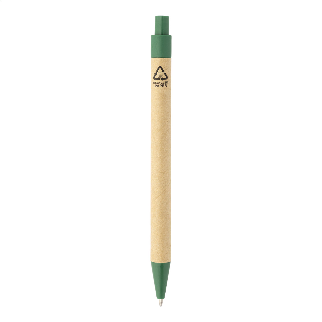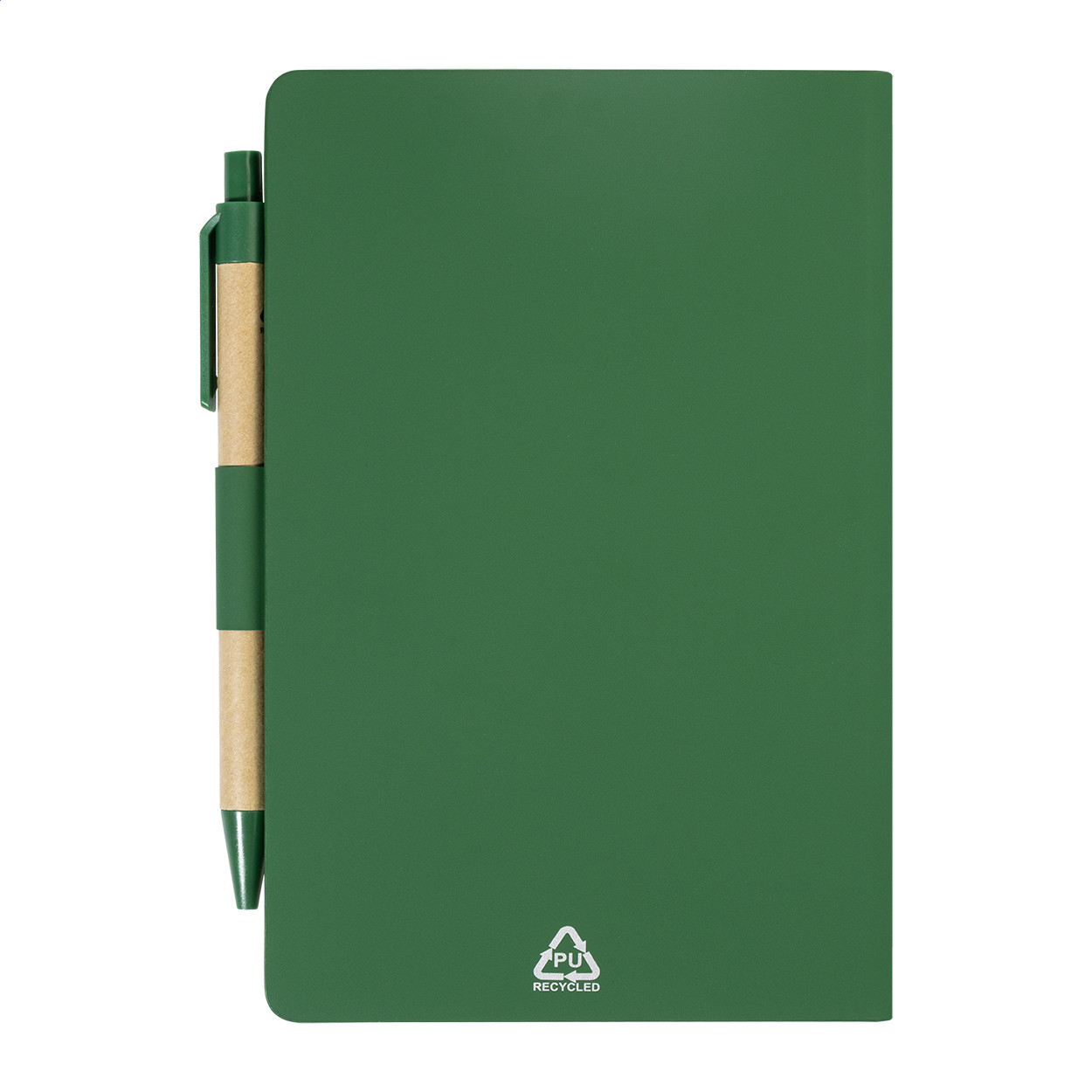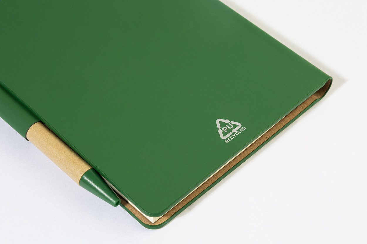 Újrahasznosított PU műbőrrel borított jegyzetfüzet 70 vonalas lappal újrahasznosított papírból és 125 oldaljelölővel (5 különböző színben). Tartalmaz egy újrahasznosított papír és újrahasznosított PP anyagú golyóstollat ​​kék tollbetéttel.