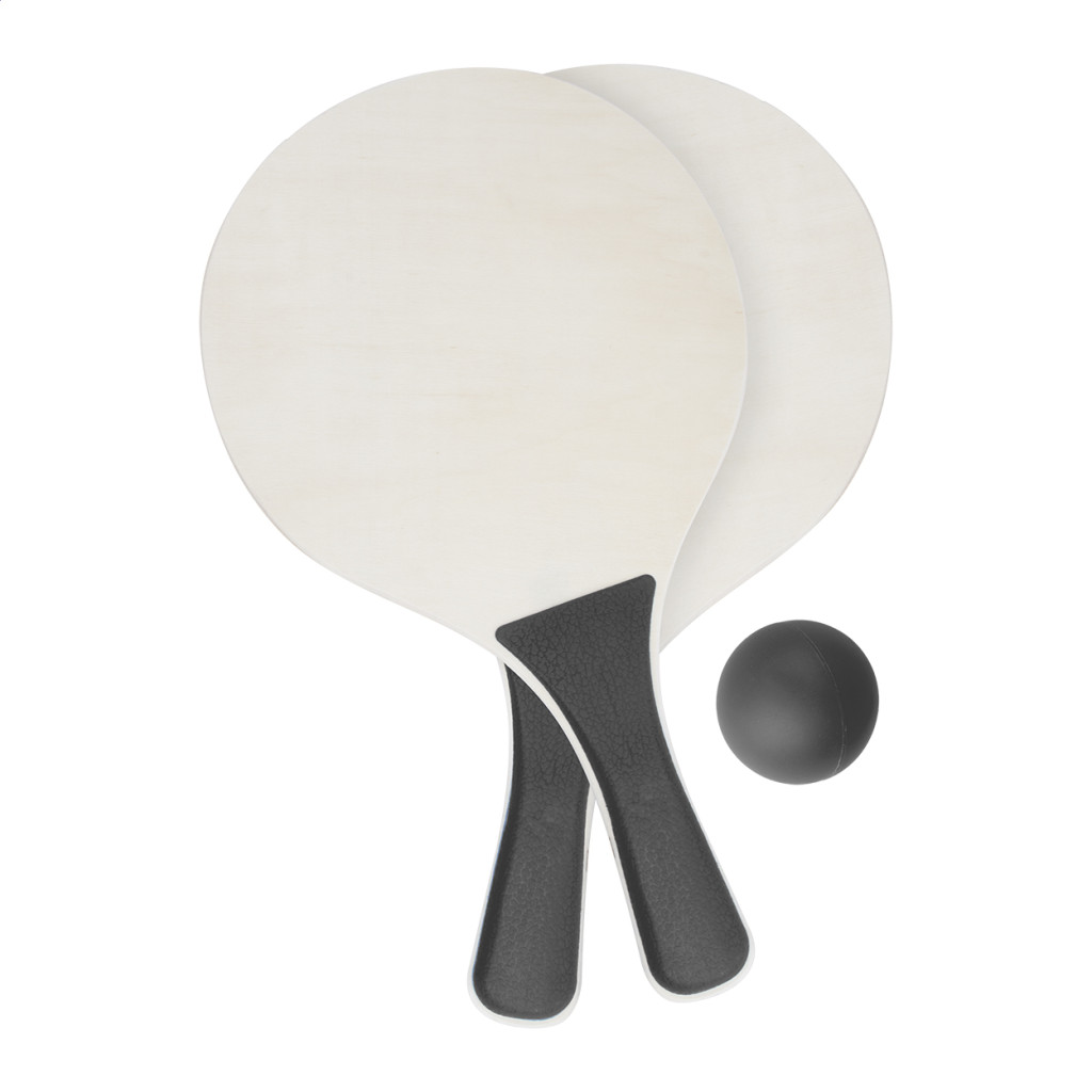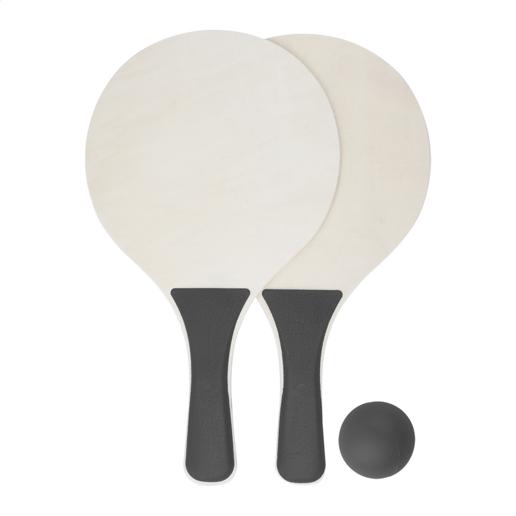Fából készült strandjáték szett, 2 db ütőt és egy labdát tartalmaz.