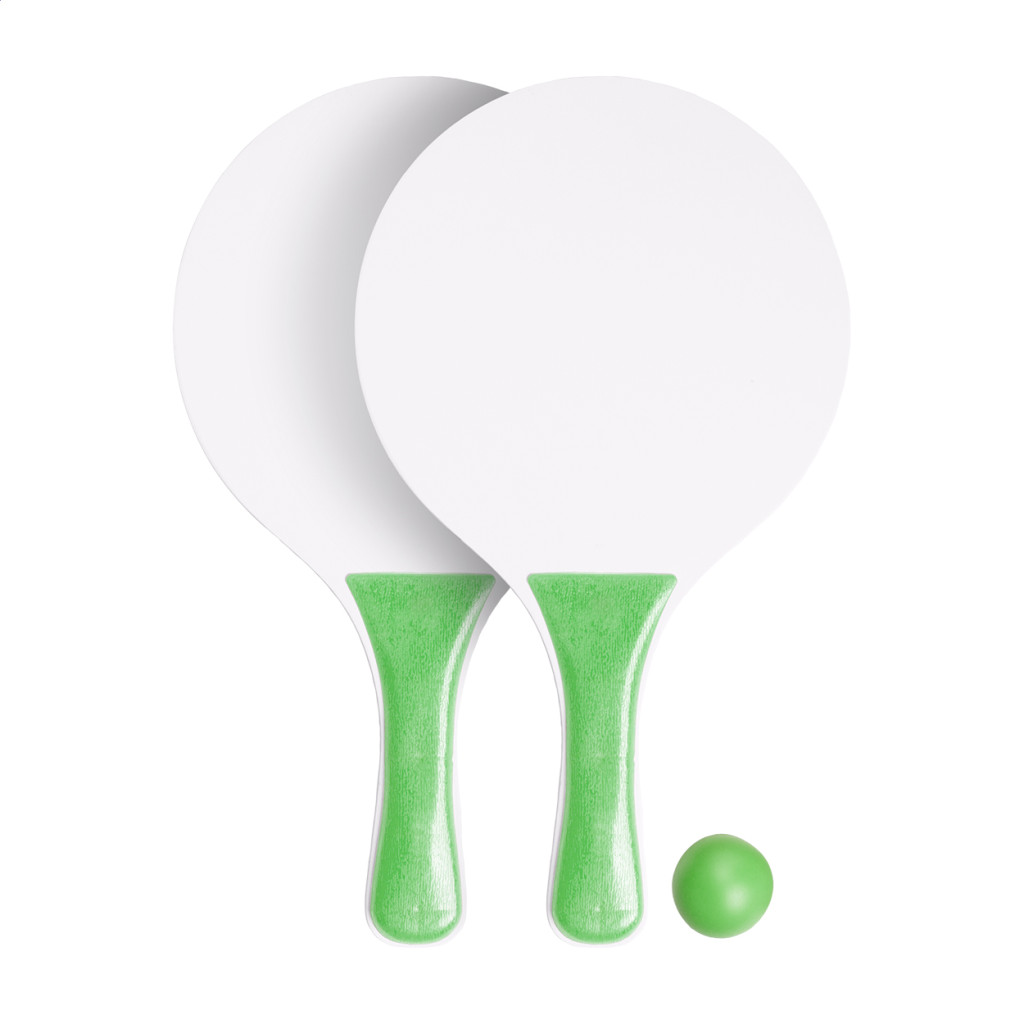 Fából készült strandjáték szett, 2 db ütőt és egy labdát tartalmaz.