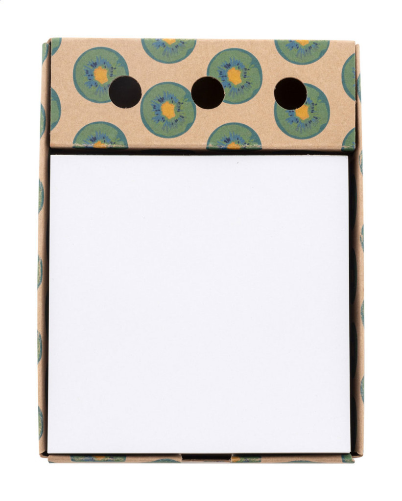 Egyedi gyártású kraft papír tolltartó és jegyzetadagoló 300 lapos jegyzettömbbel, újrahasznosított papírból (90×90 mm). Az ár tartalmazza a tartón lévő full-colour nyomtatást. Minimális rendelési mennyiség: 100 db.