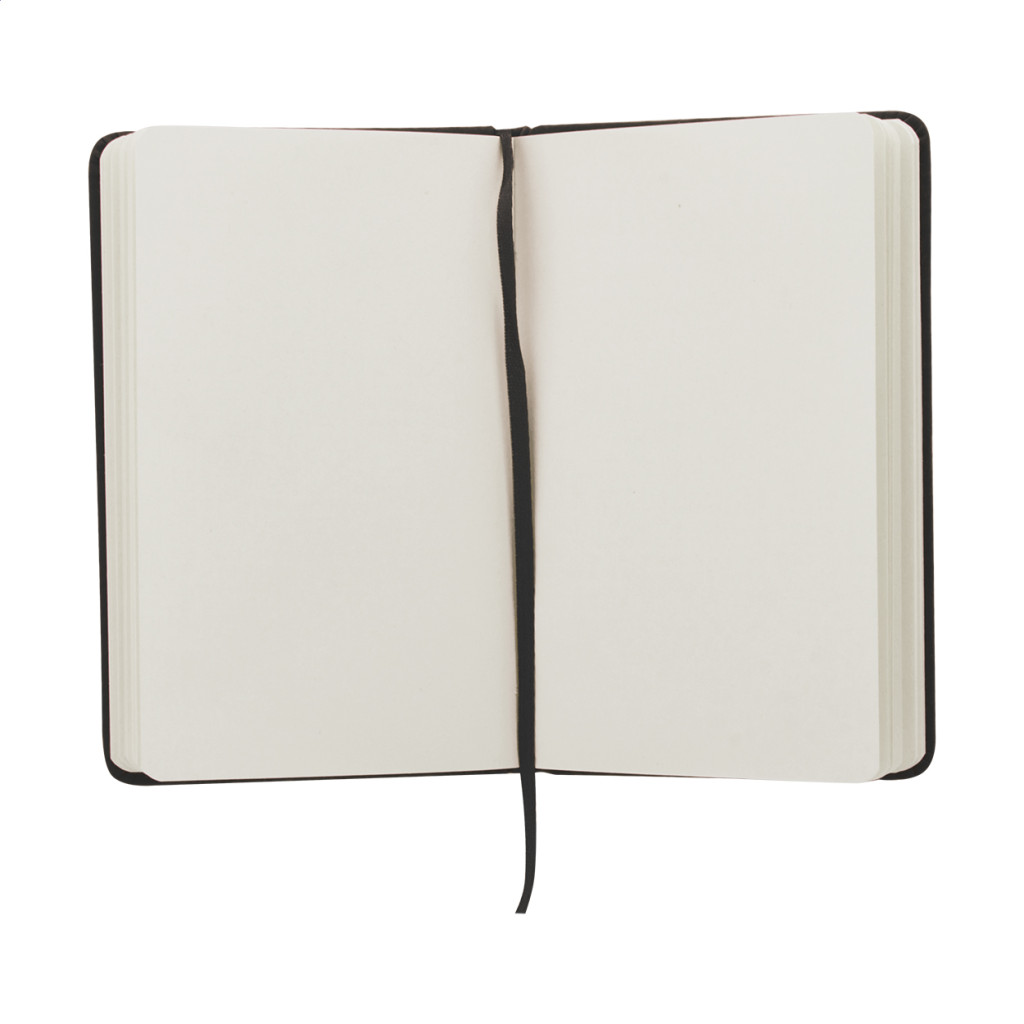 PU bőr borítású jegyzetfüzet 100 sima lappal, könyvjelzővel, gumipánttal zárható. A6 méretű.