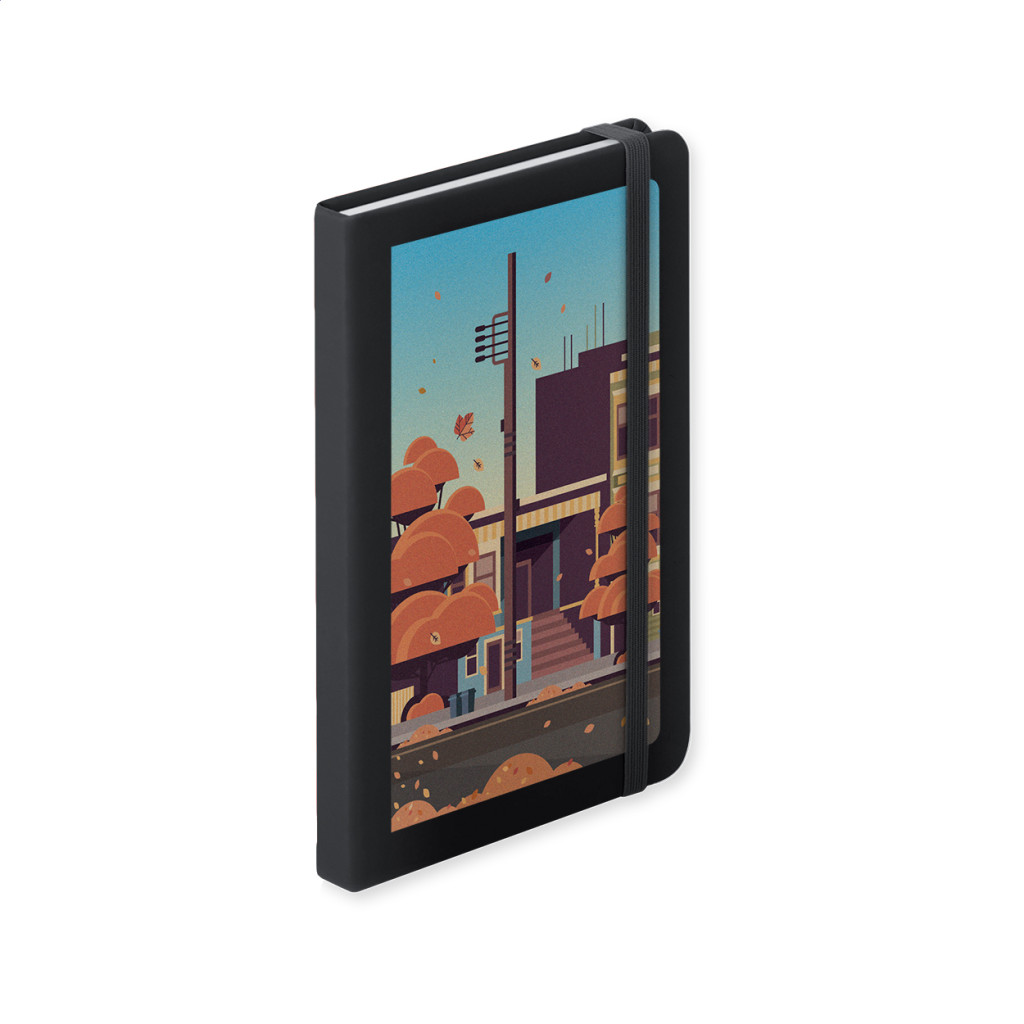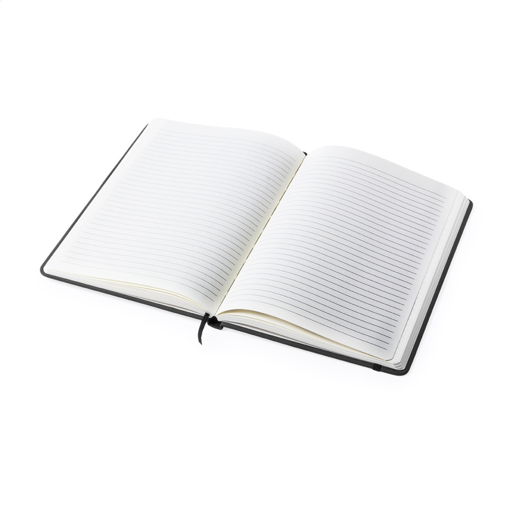 PU bőr borítású jegyzetfüzet 100 vonalas lappal, könyvjelzővel, gumipánttal zárható.