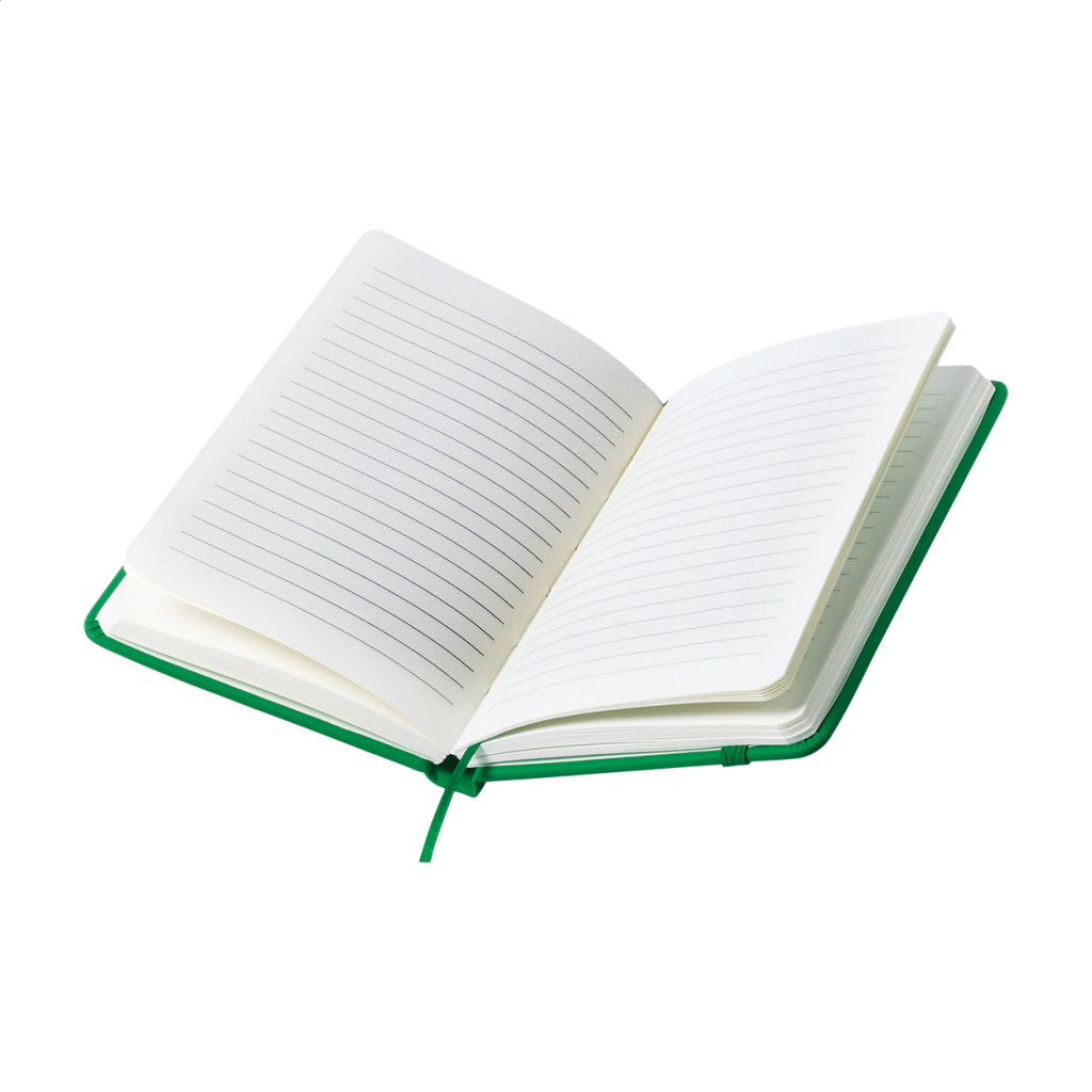 PU bőr borítású jegyzetfüzet 100 vonalas lappal, könyvjelzővel, gumipánttal zárható. A6 méretű.