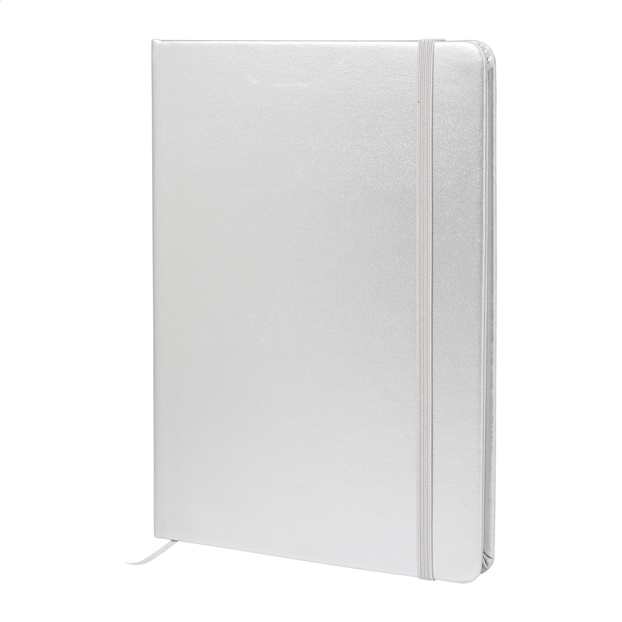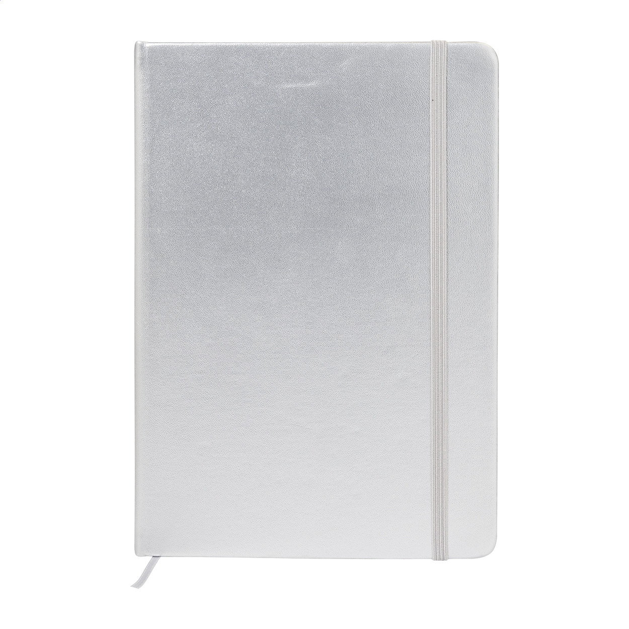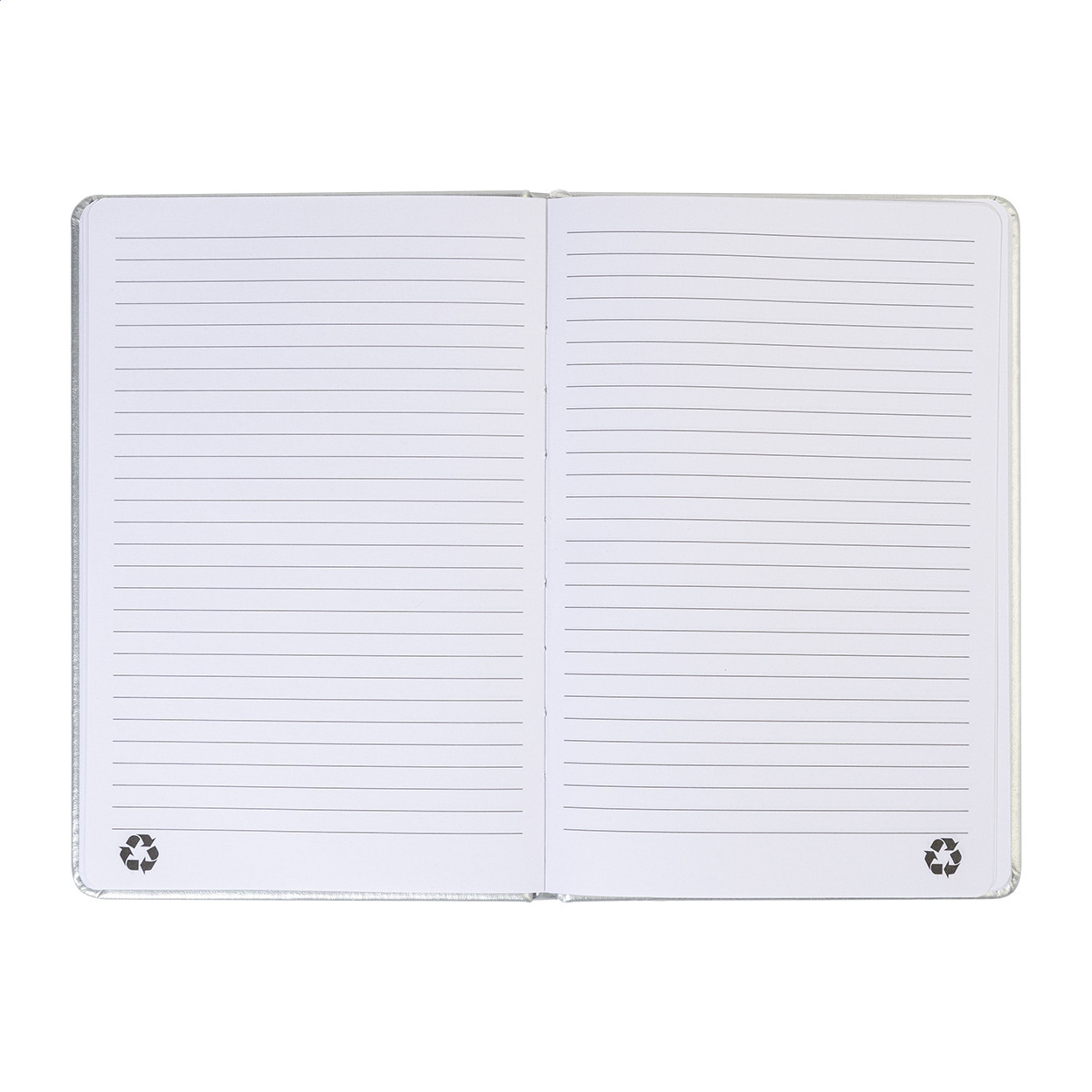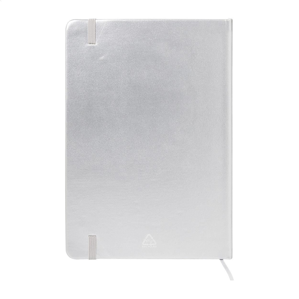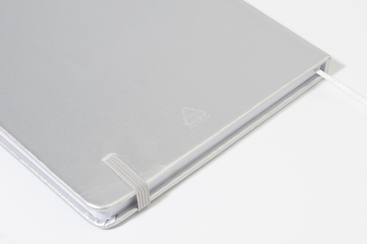 Fémes felületű, újrahasznosított PU műbőrrel borított jegyzetfüzet 100 vonalas lappal, újrahasznosított papírból. Színben megegyező könyvjelzővel és gumiszalaggal. A5-ös méret.
