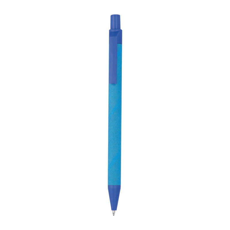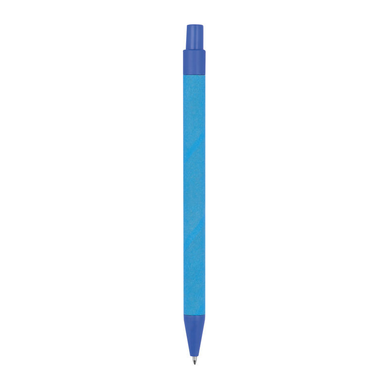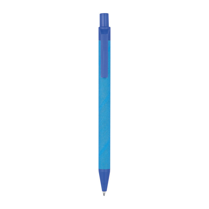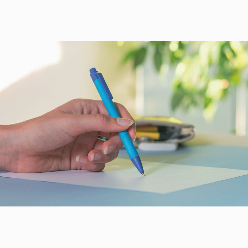 Környezetbarát, kéken író golyóstoll újrahasznosított papírból. A színes kiegészítők kukoricából készültek.