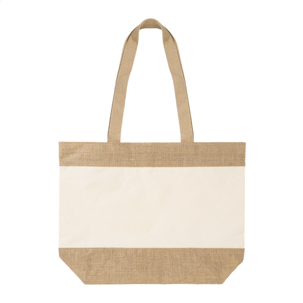 Laminált juta és laminált pamut keverékéből készült színes strandtáska, hosszú hordfüllel.
