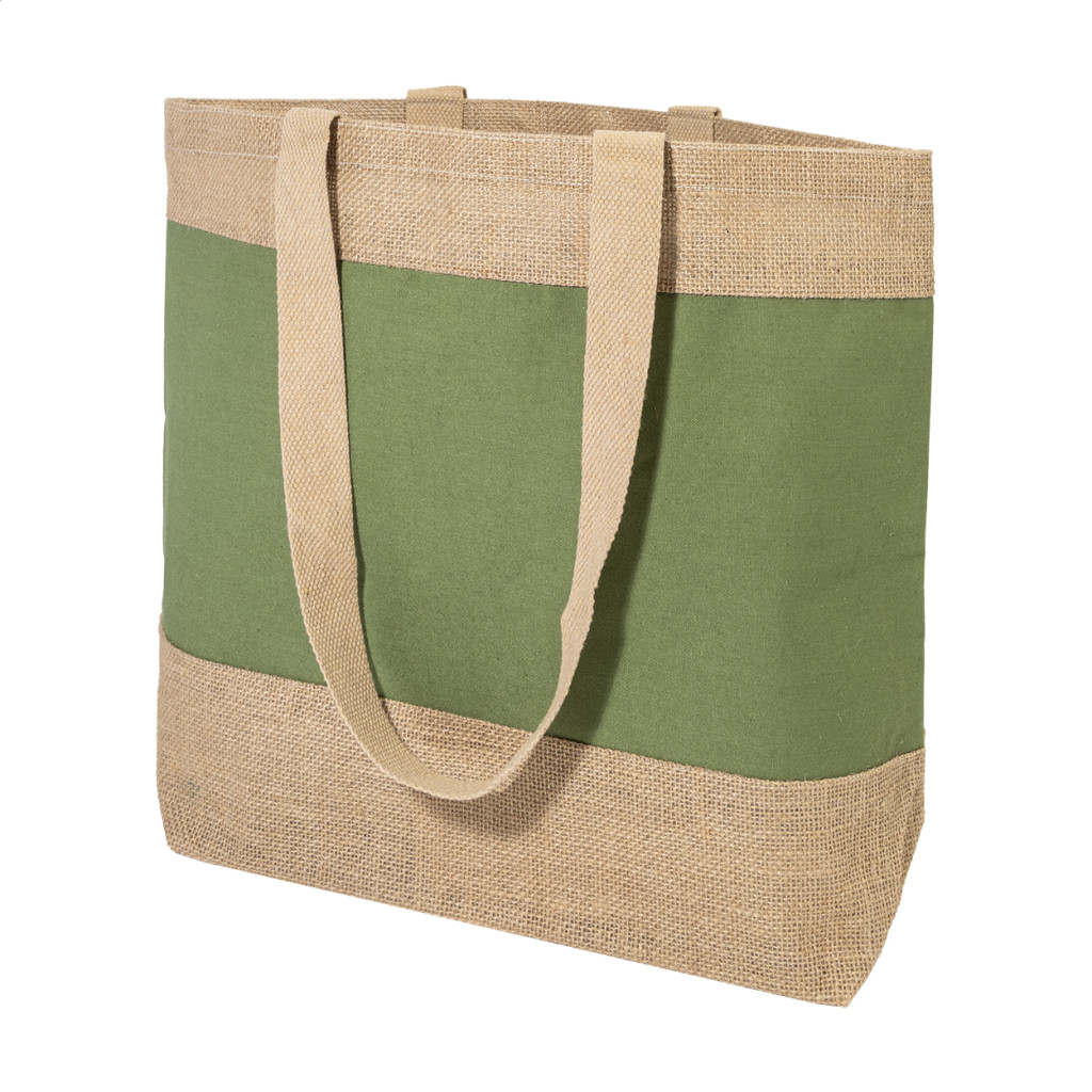 Laminált juta és laminált pamut keverékéből készült színes strandtáska, hosszú hordfüllel.