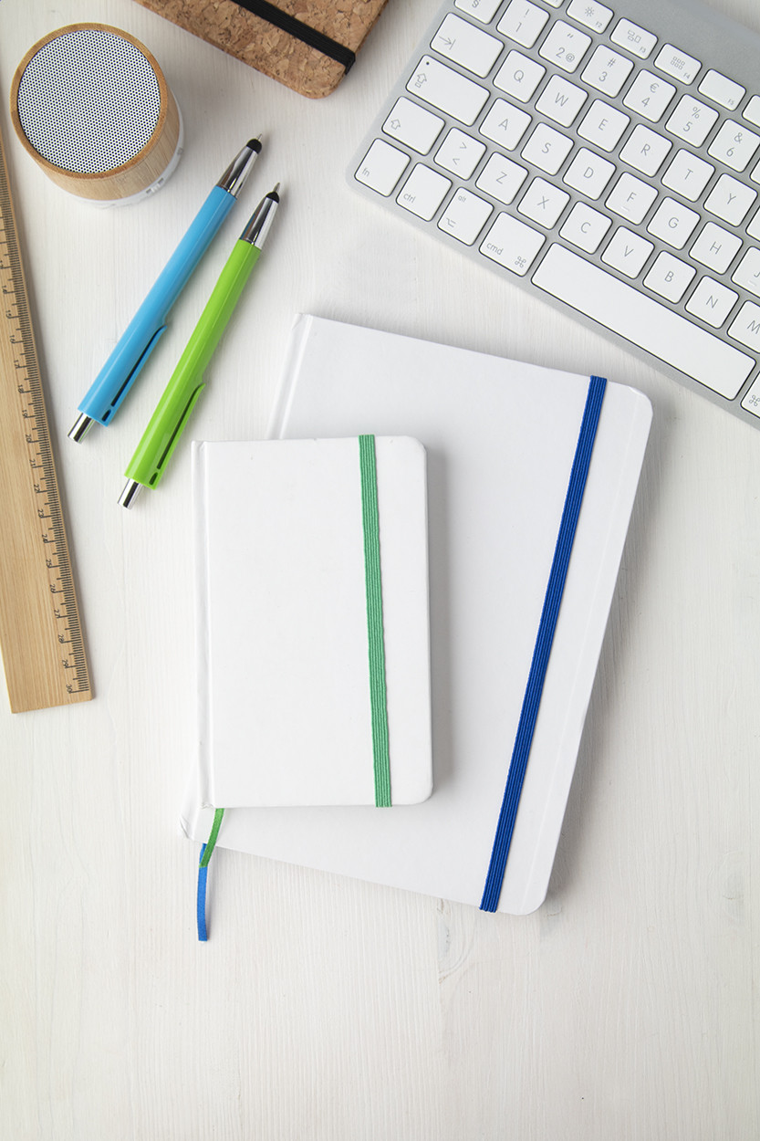 Papír borítású jegyzetfüzet 100 sima lappal, színezett lapélekkel és azonos színű könyvjelzővel és gumipánttal, A5.