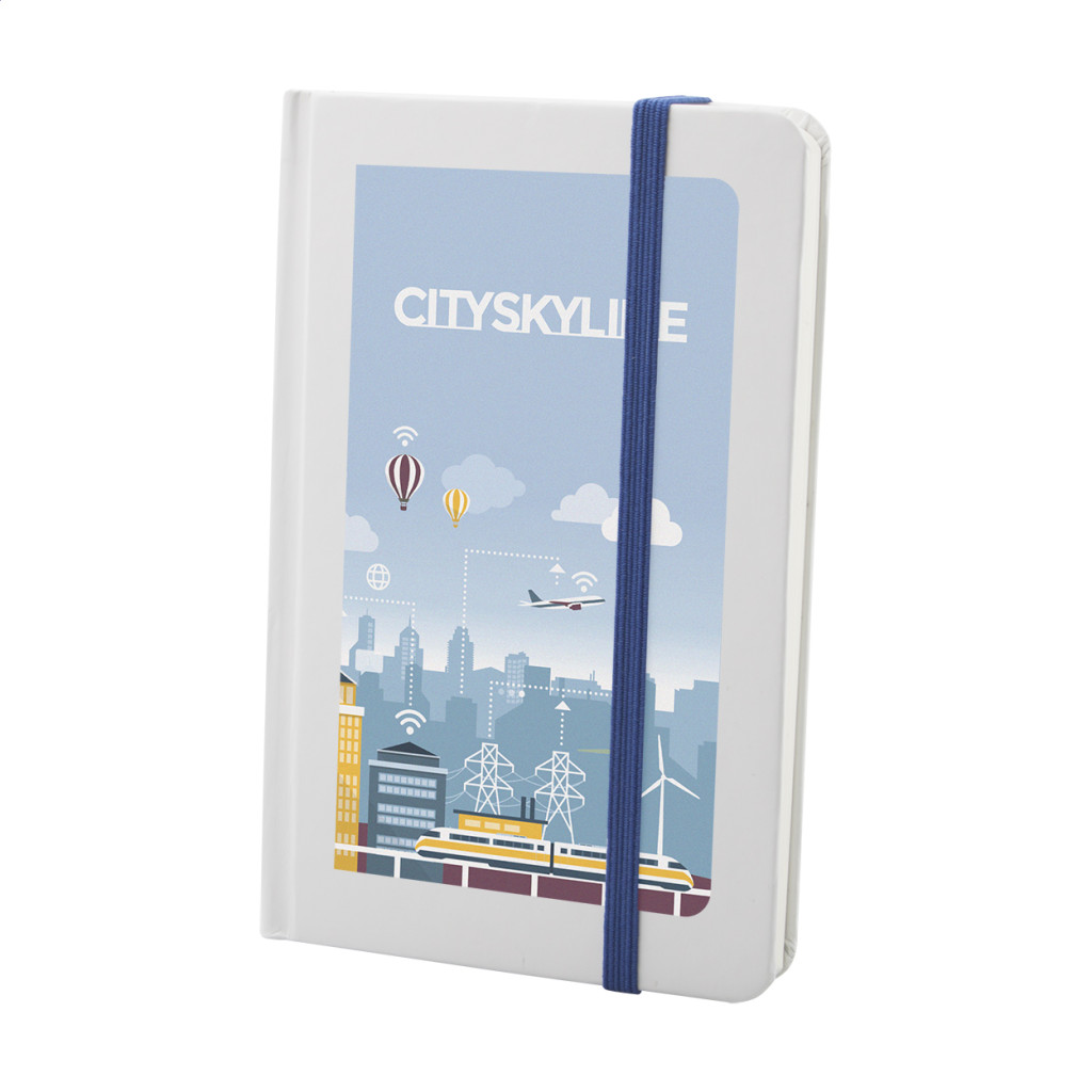 Fehér kartonpapír borítású jegyzetfüzet 80 sima lappal, színes gumipánttal zárható. A6 méretű.