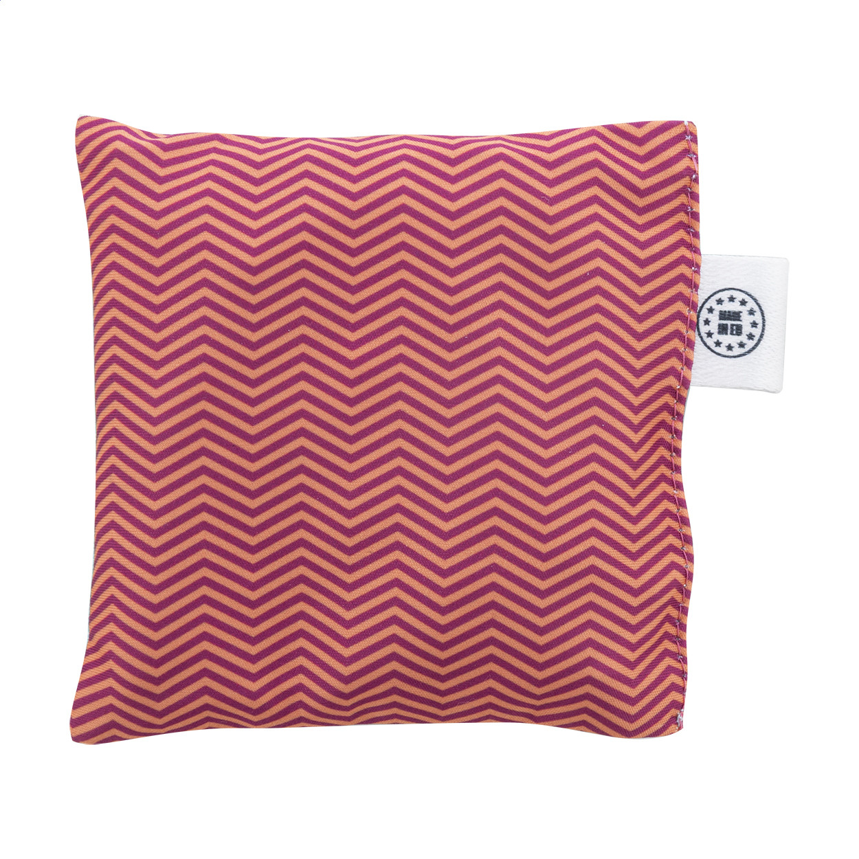Egyedi gyártású, RPET mikroszálas bevonatú, cseresznyemaggal töltött melegítőpárna. Kompakt méretben, fülre tervezve. Teljes felületén szublimációs grafikával és megkülönböztető RPET címkével. Minimális rendelési mennyiség: 50 db.