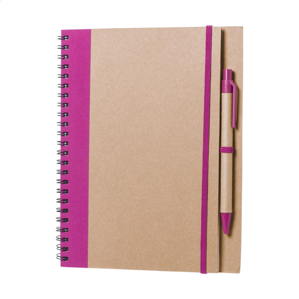 Újrahasznosított papírból készült spirálozott jegyzetfüzet 60 sima lappal, papír golyóstollal.