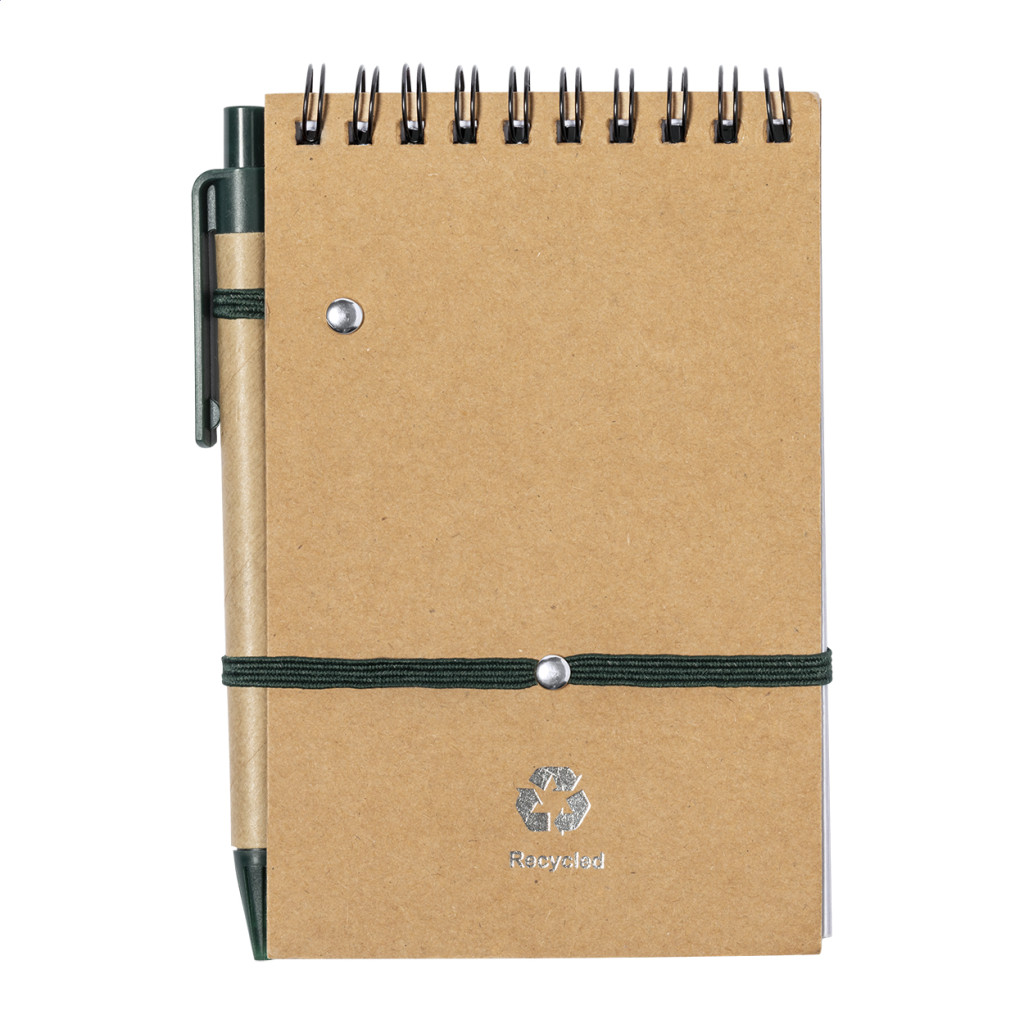 Újrahasznosított papírból készült spirál jegyzetfüzet 70 vonalas lappal, újrahasznosított karton golyóstollal. Kék tollbetéttel szállítjuk. A6 méretű.
