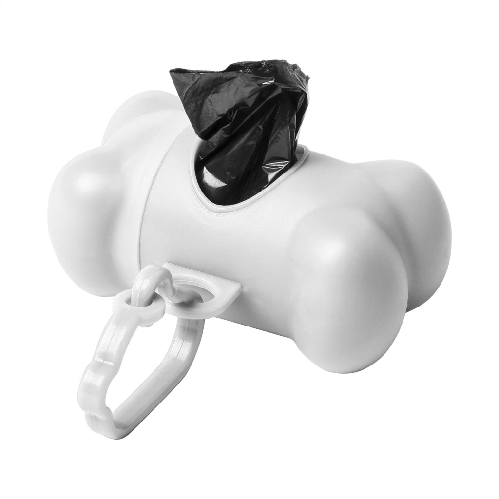 Csont alakú műanyag tartó, 15 db kutyapiszok gyűjtő zacskóval és karabinerrel.
