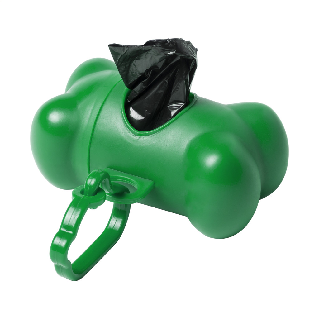Csont alakú műanyag tartó, 15 db kutyapiszok gyűjtő zacskóval és karabinerrel.