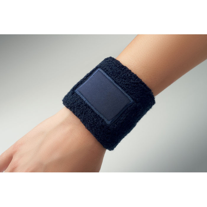 Csuklópánt poliészter-pamut kevert szálas anyagból (79% pamut, 13% elasztán, 8% poliészter), emblémázható pamut felvarróval.
