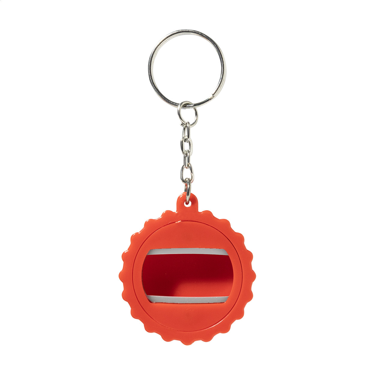 Újrahasznosított ABS műanyagból készült, kupak alakú kulcstartó üvegnyitóval.