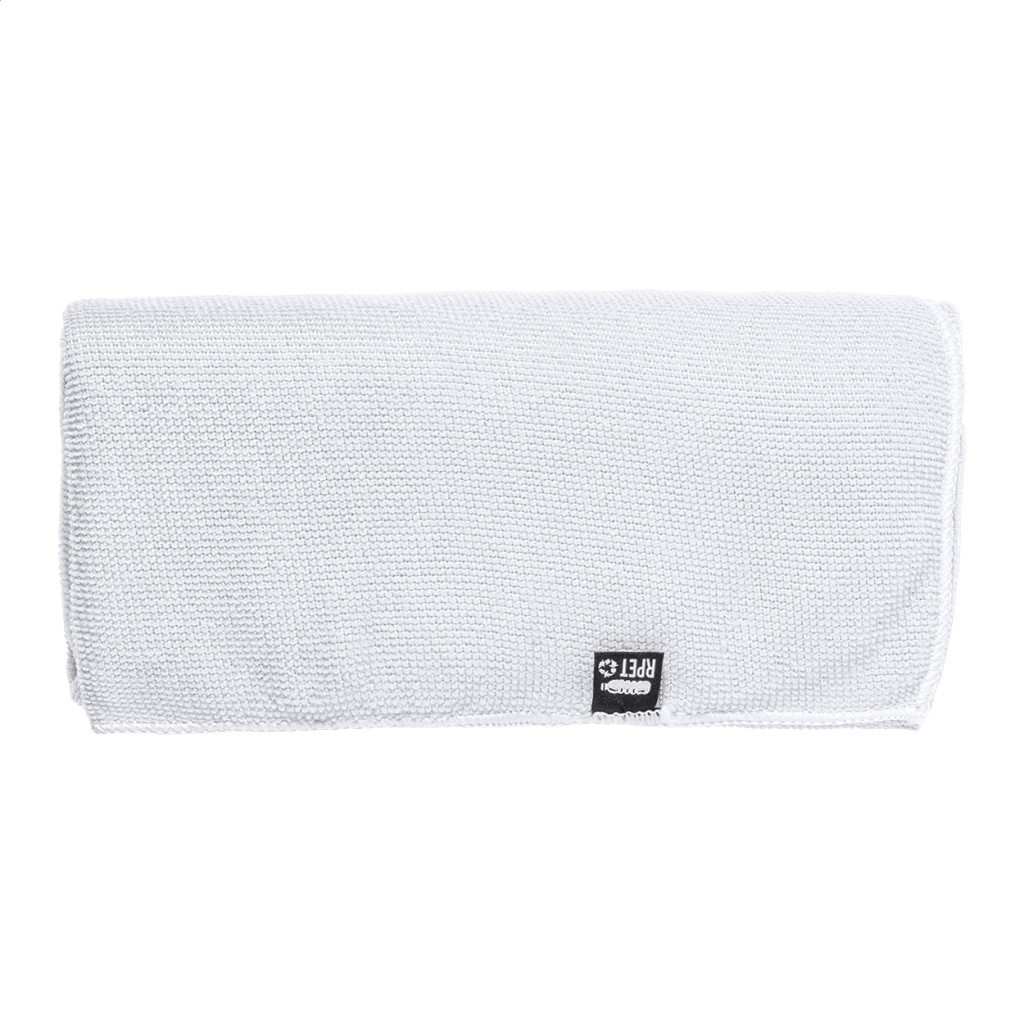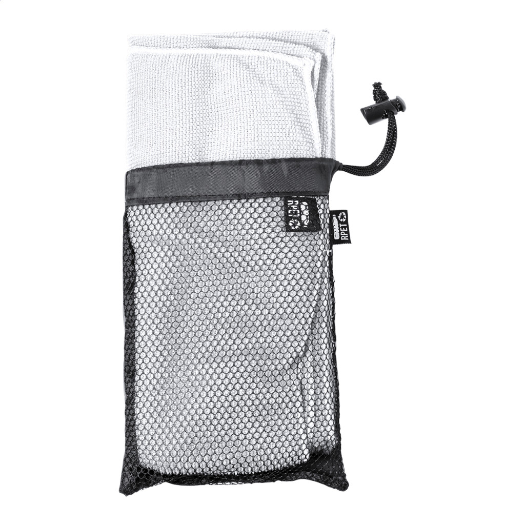 Mikroszálas, RPET poliészter anyagú sport törölköző hordtáskában, RPET címkével ellátva. 160 g/m².