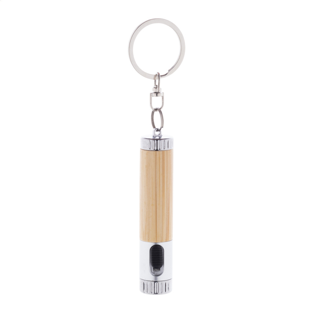 Bambusz és újrahasznosított ABS műanyag mini elemlámpa 1 LED-del és fém kulcstartóval. Gombelemmel szállítjuk.