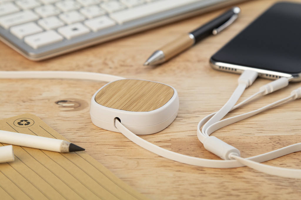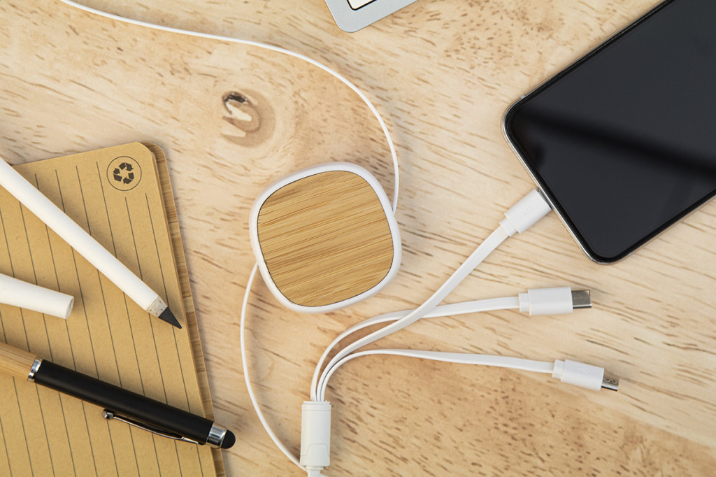 Teleszkópos USB töltőkábel újrahasznosított ABS műanyagból és bambuszból. Mikro USB, USB-C és Lightning csatlakozókkal. USB és USB-C bemenettel ellátva.
