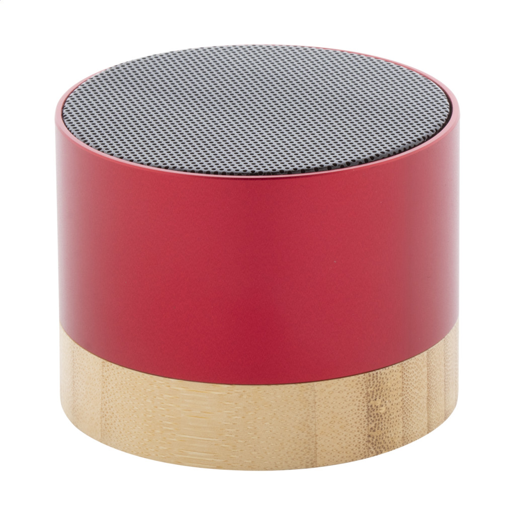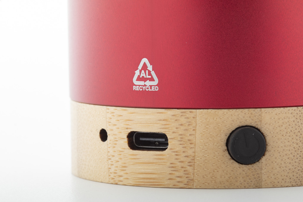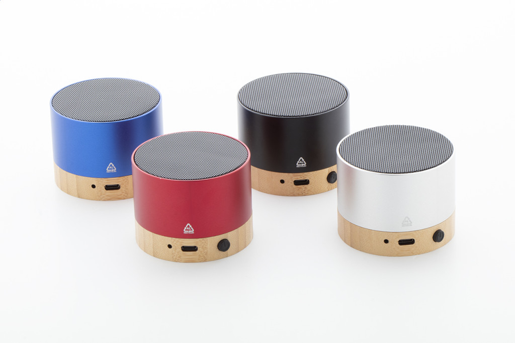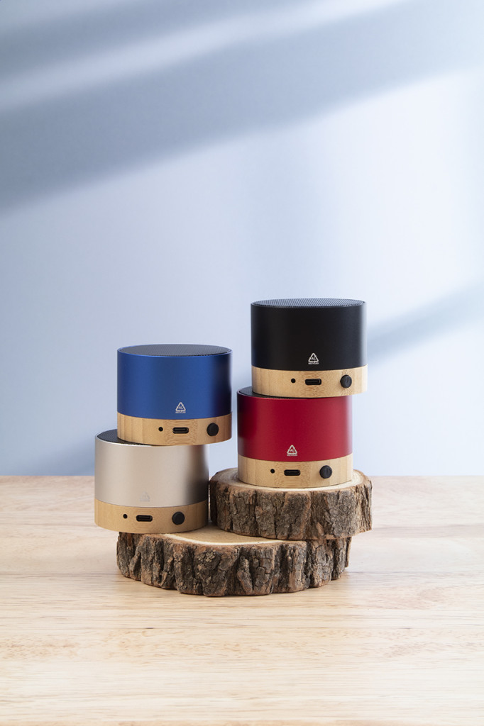 Újrahasznosított alumínium vezeték nélküli hangszóró bambusz alappal. Kihangosító funkcióval és beépített újratölthető akkumulátorral. USB töltőkábellel szállítjuk.