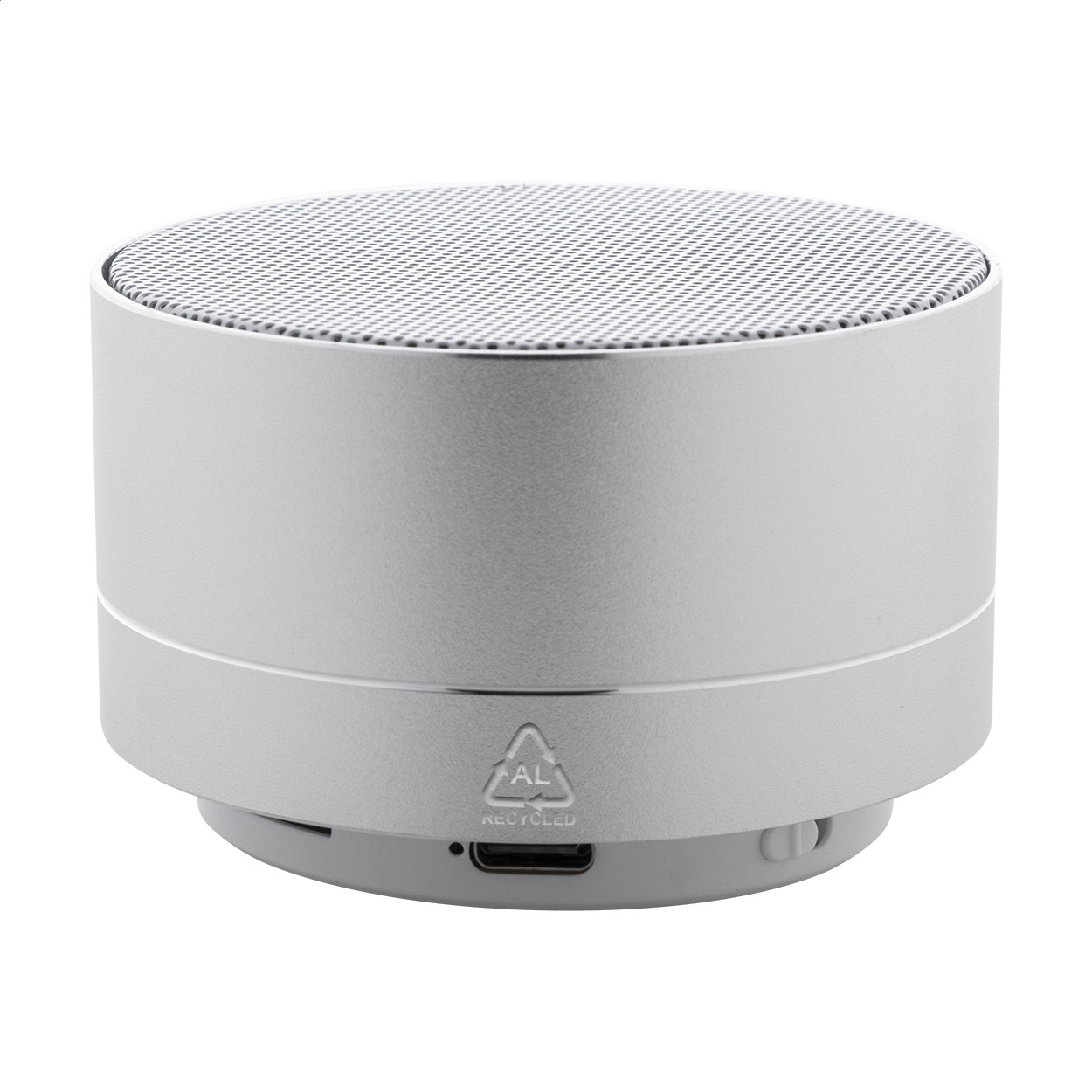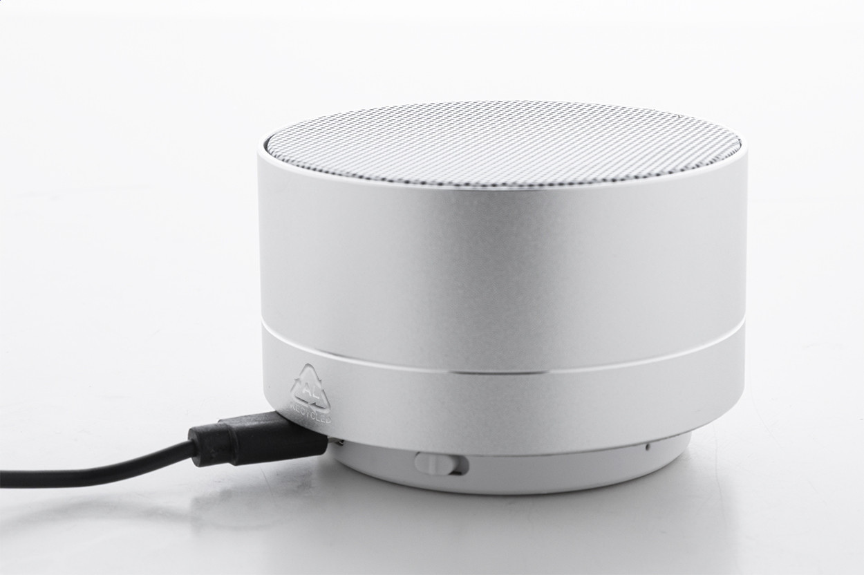 Újrahasznosított alumínium vezeték nélküli hangszóró fém hálóval, alján LED lámpával és újratölthető akkumulátorral (300 mAh). Kihangosító és micro SD MP3 lejátszási funkciókkal. USB töltőkábellel.