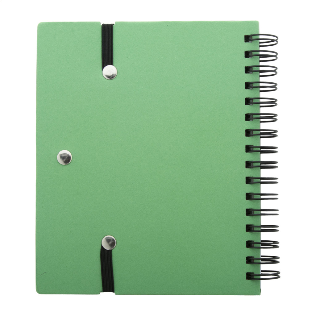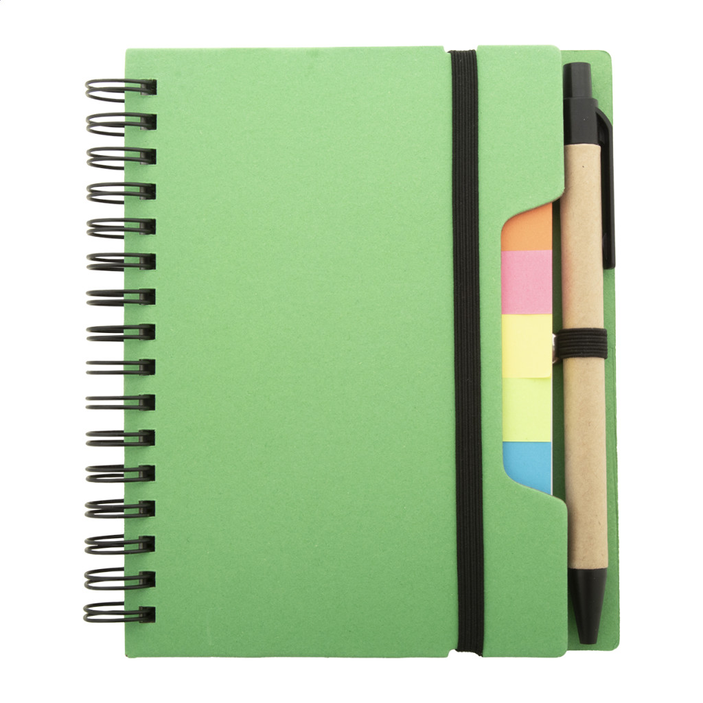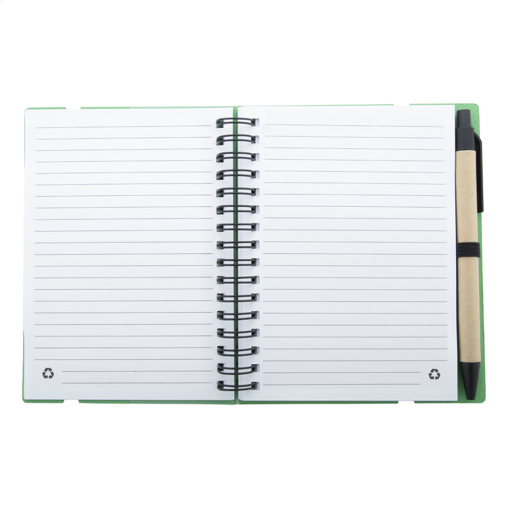 Újrahasznosított papírból készült spirálfüzet 70 vonalas lappal és 125 oldaljelölővel (5 különböző színben). Gumipánttal és tolltartóval. A6 méretű. Újrahasznosított papírból készült golyóstollal és kék tollbetéttel szállítjuk.