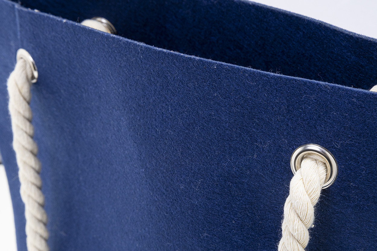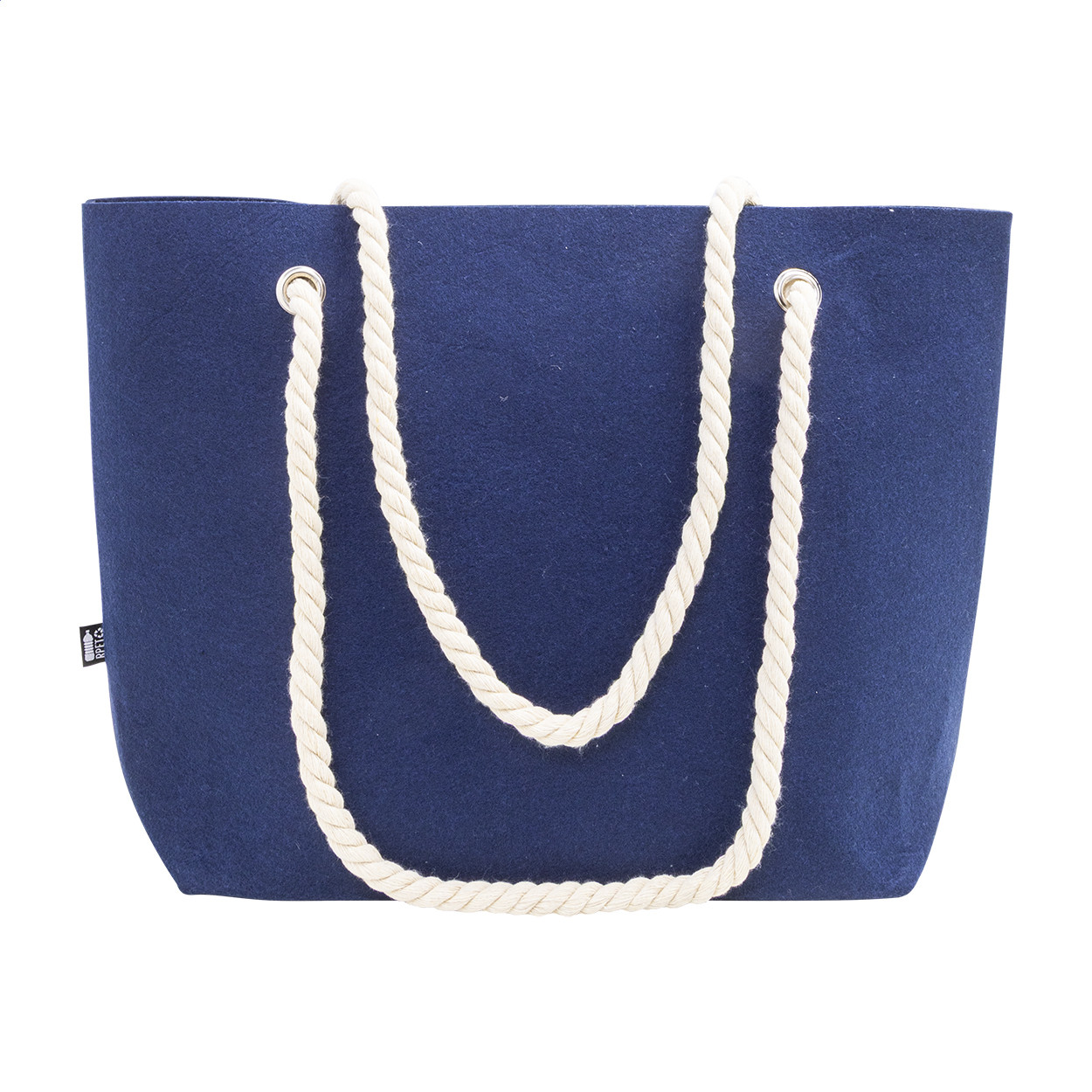 RPET filc strand- vagy bevásárlótáska pamut zsinóros fogantyúkkal és alsó betoldással. Megkülönböztető RPET címkével.