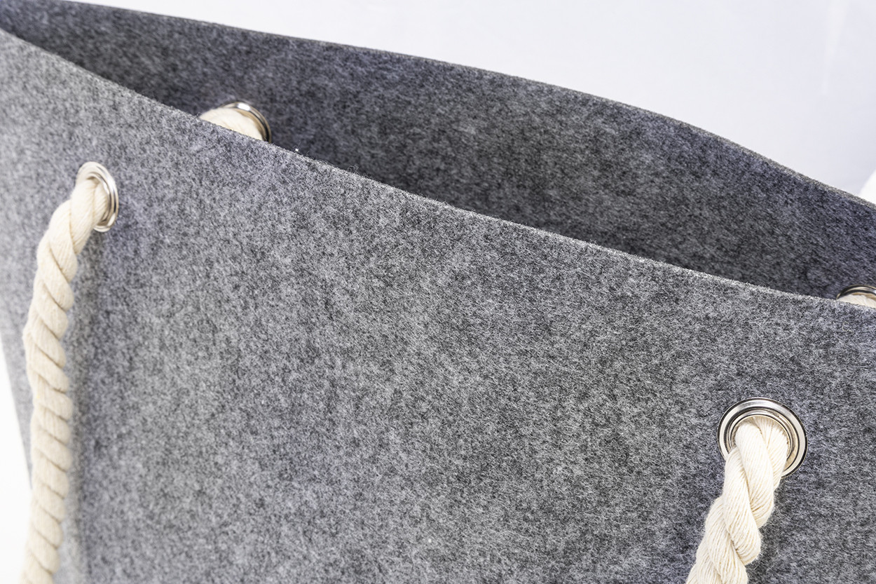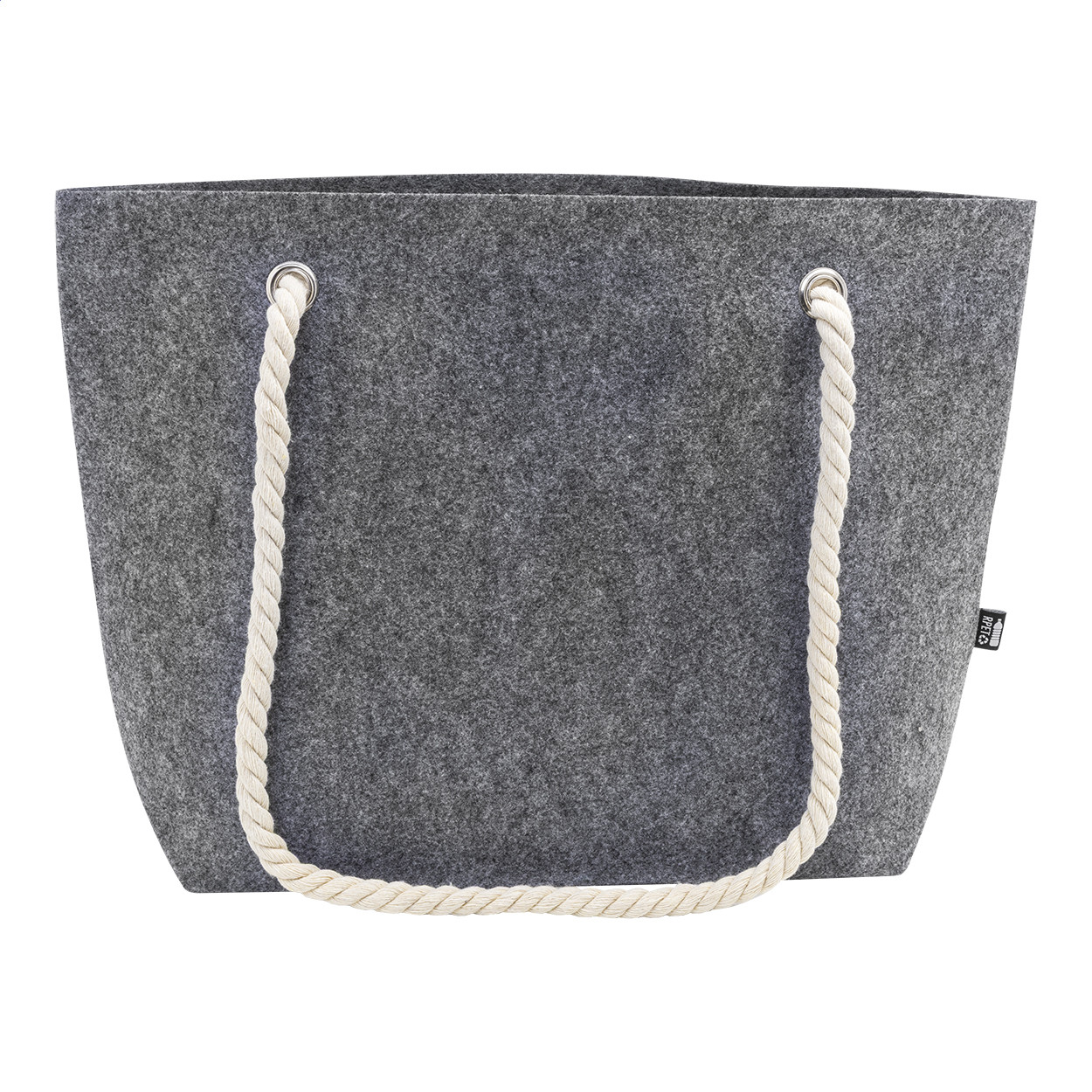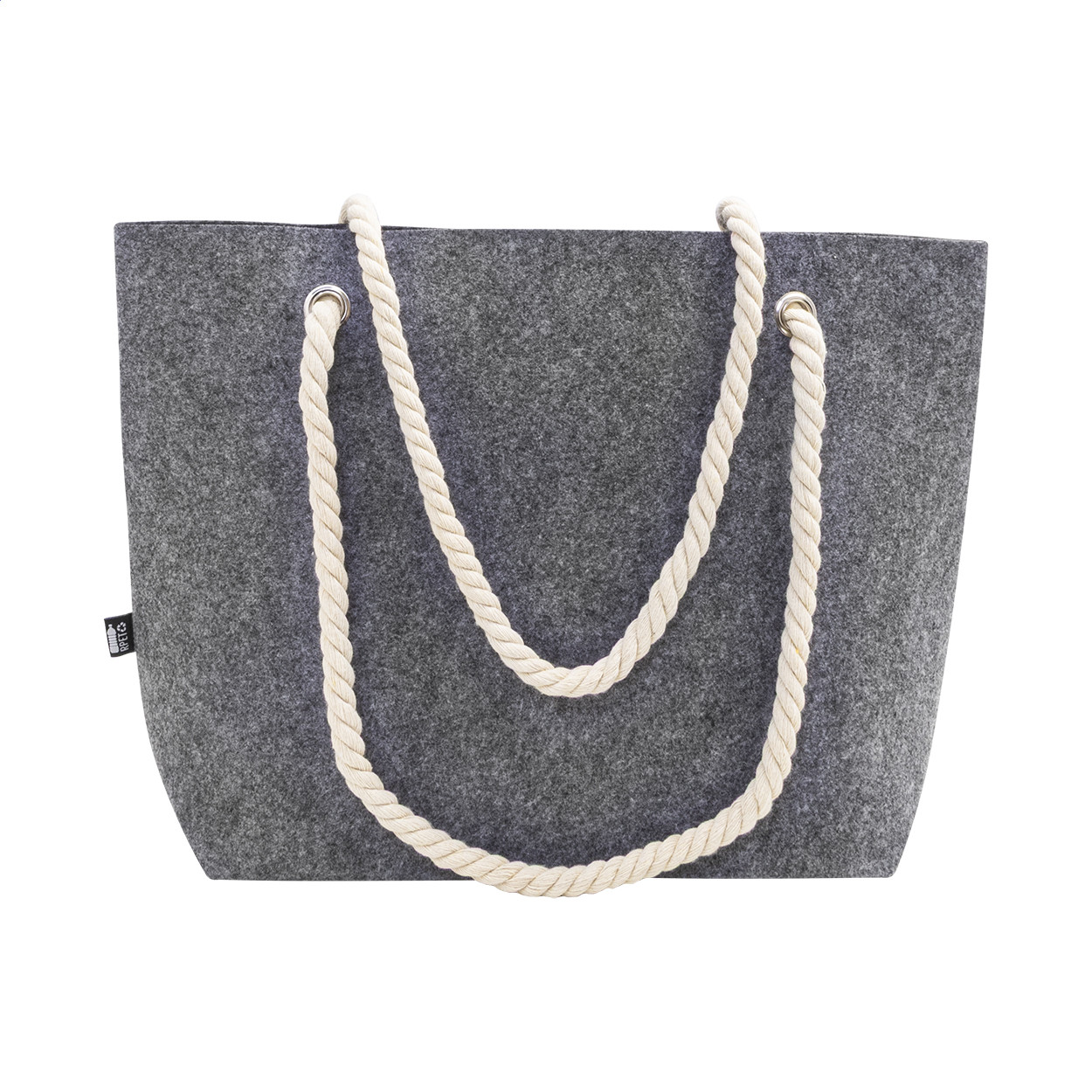 RPET filc strand- vagy bevásárlótáska pamut zsinóros fogantyúkkal és alsó betoldással. Megkülönböztető RPET címkével.