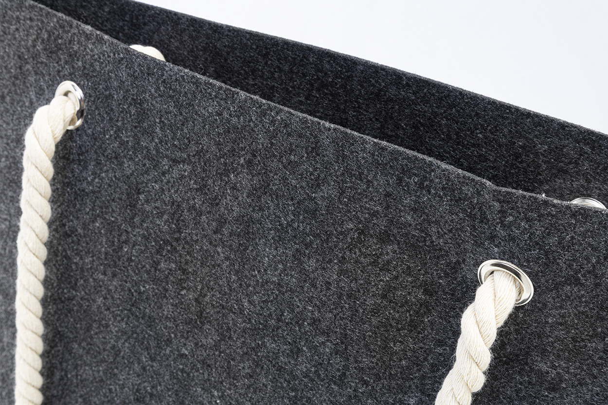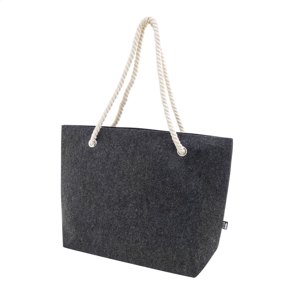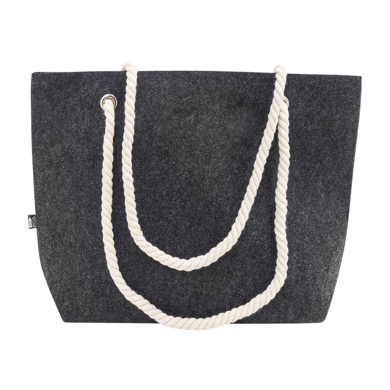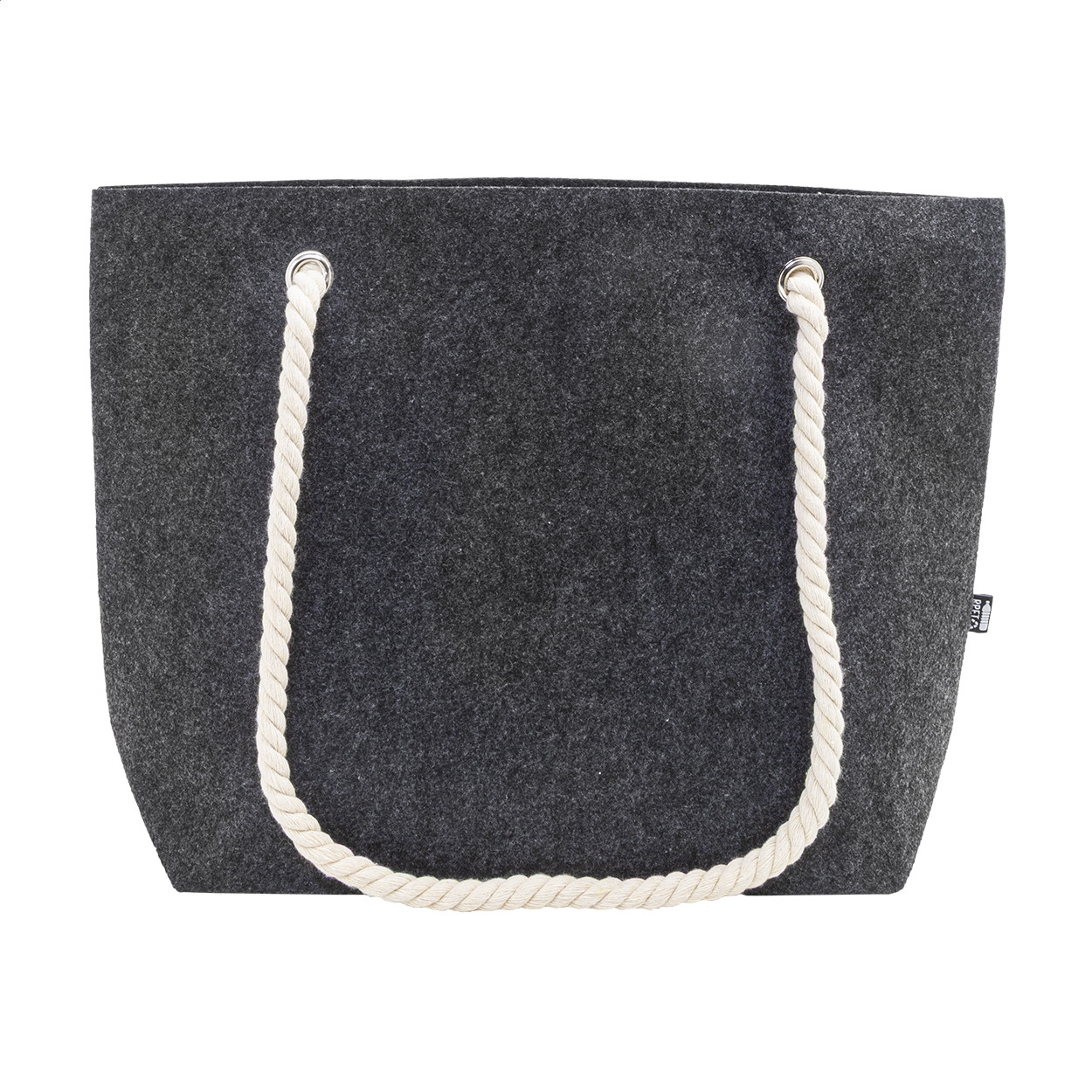 RPET filc strand- vagy bevásárlótáska pamut zsinóros fogantyúkkal és alsó betoldással. Megkülönböztető RPET címkével.